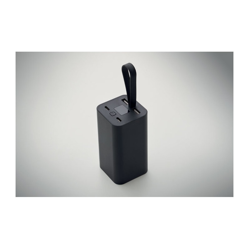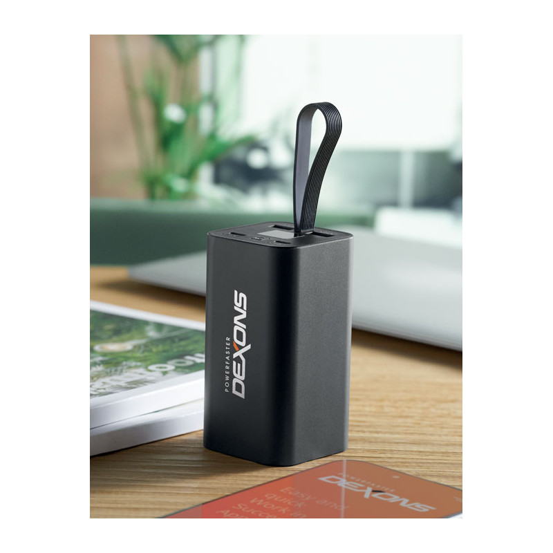 20.000 mAh power bank made of recycled aluminium with a digital power display and silicone hanger. Features two Type-C and two USB-A outputs with PD 65W fast charging.