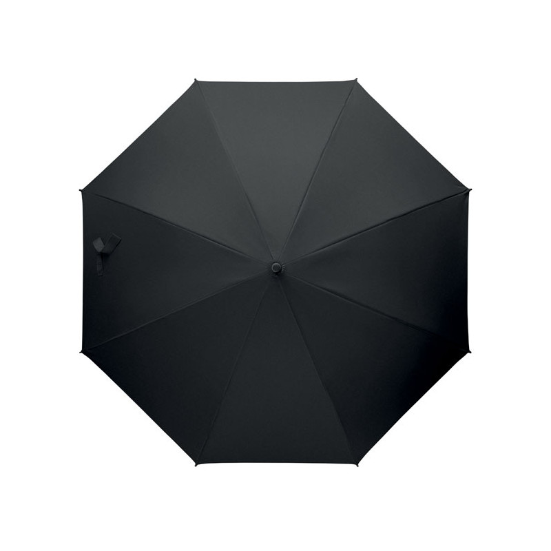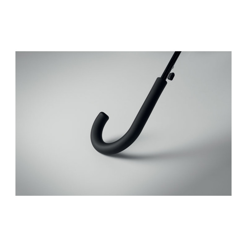 23 inch straight auto open umbrella with black plating metal frame, fibreglass ribs and panels in 190T pongee fabric. Plastic tips and top. Rubberized PP plastic curved handle. Manual closure.