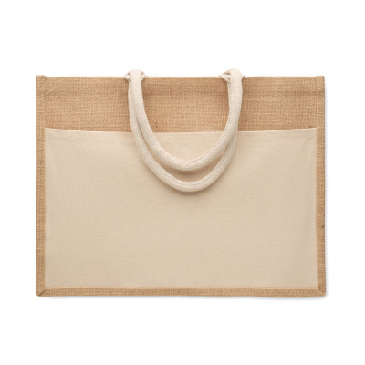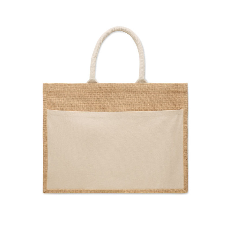 Shopping bag made of laminated jute and 280 gr/m² cotton canvas with cord handles. Includes large open front pocket.