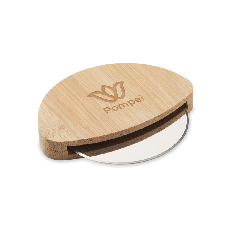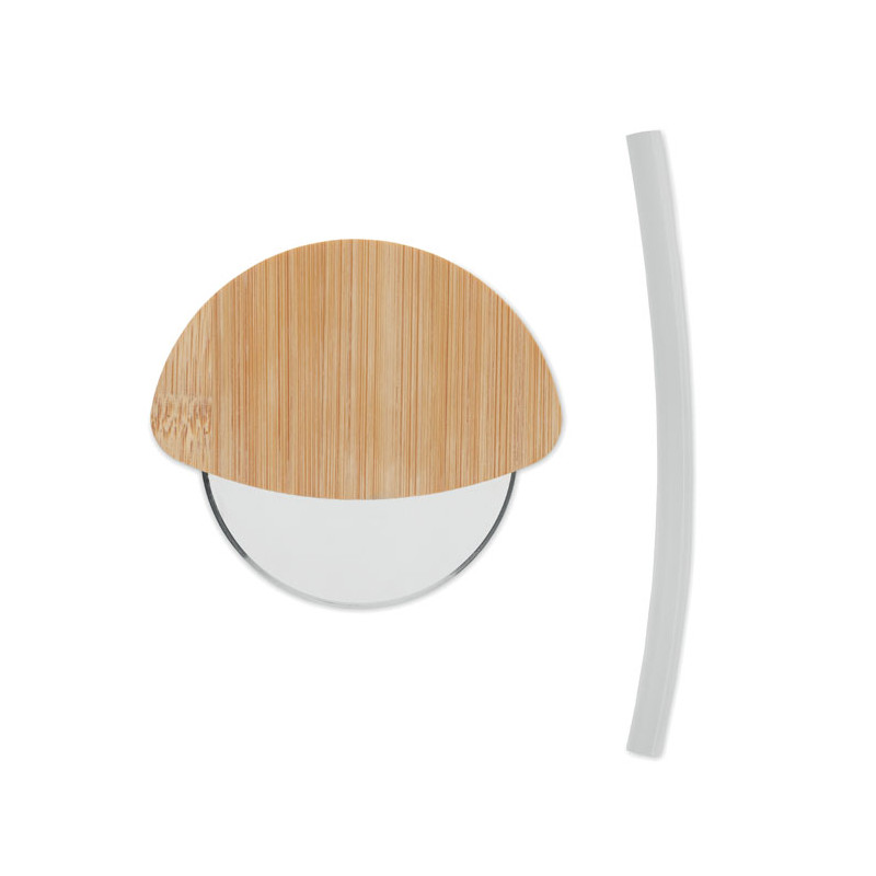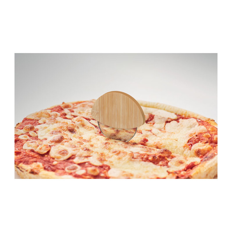 Round pizza cutter with bamboo handle and stainless steel blade. Features transparent white silicone protection ring.