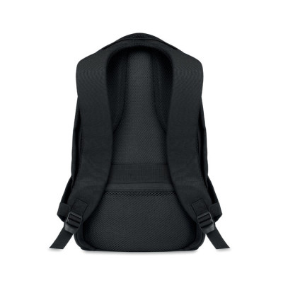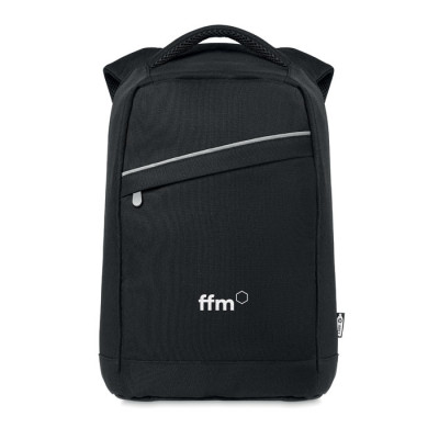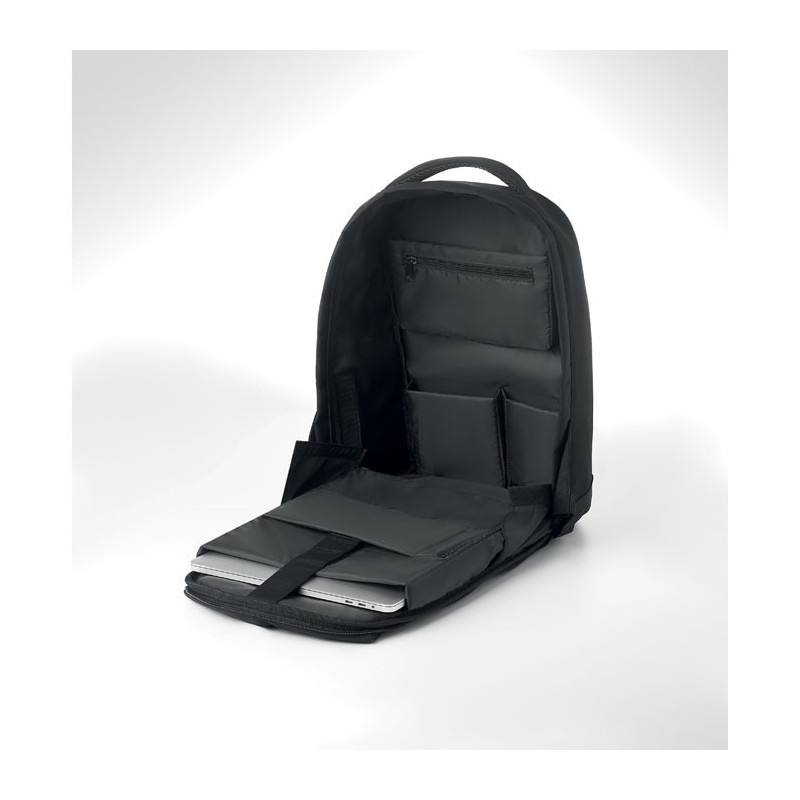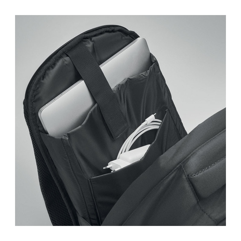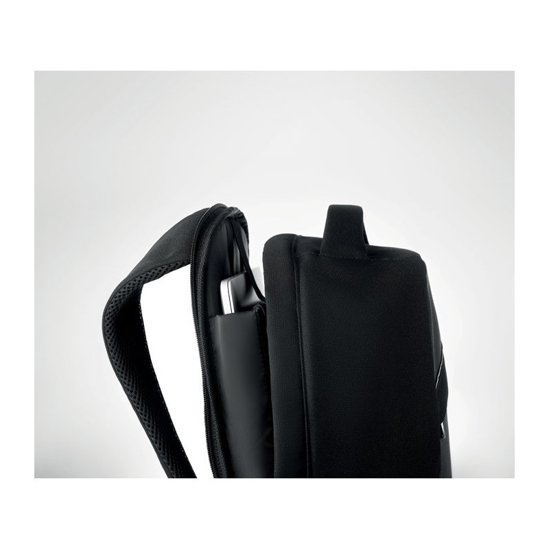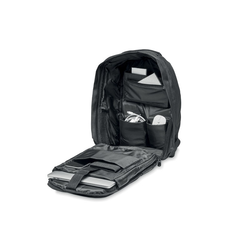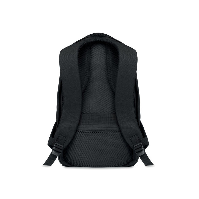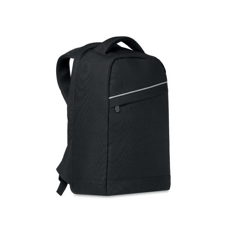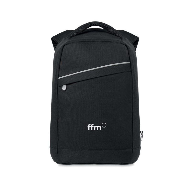 600D RPET backpack with padded shoulder strap with main internal compartment. It has a zippered front pocket. Includes one internal 13 inch laptop compartment. Zipper main compartment on backside for better security.