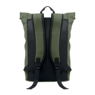 15 inch roll top laptop backpack in soft PU with padded back and base reinforcement with reflective strip. Waterproof zippered front pocket. 210D RPET polyester lining.