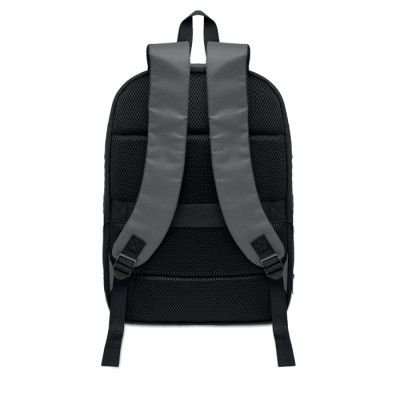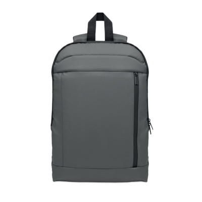 Expandable 600D RPET polyester computer backpack 16'' with PU coating on front and RPET polyester lining. Hidden zippered pocket and padded laptop compartment, front compartment, mesh back and luggage strap.