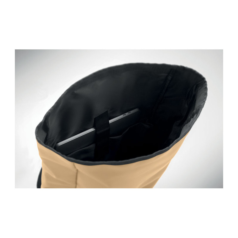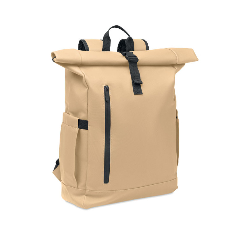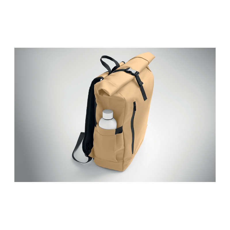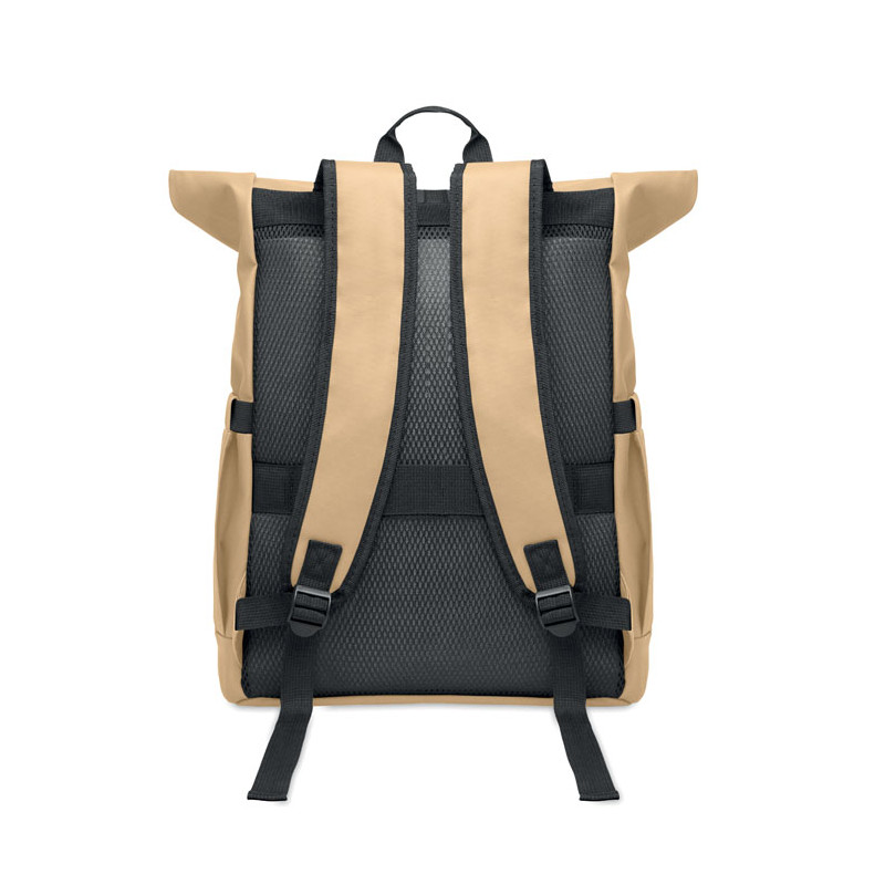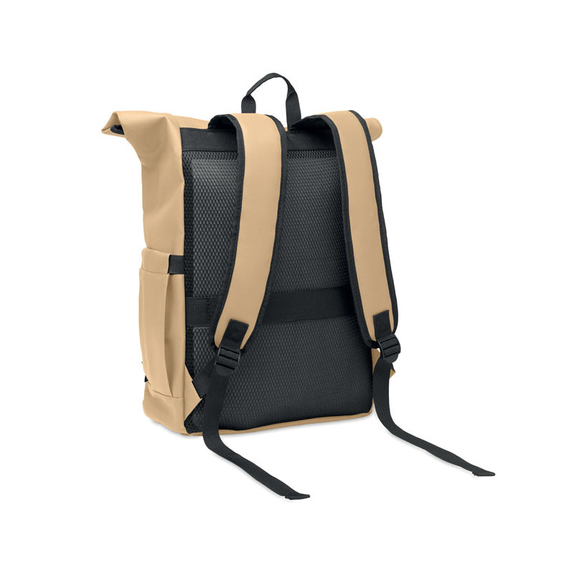 Roll top 15 inch laptop backpack in PU coated 600D RPET polyester and RPET polyester lining. Meshed padded back with zippered pocket and trolley strap. Padded shoulder strap with mesh inside finishing.