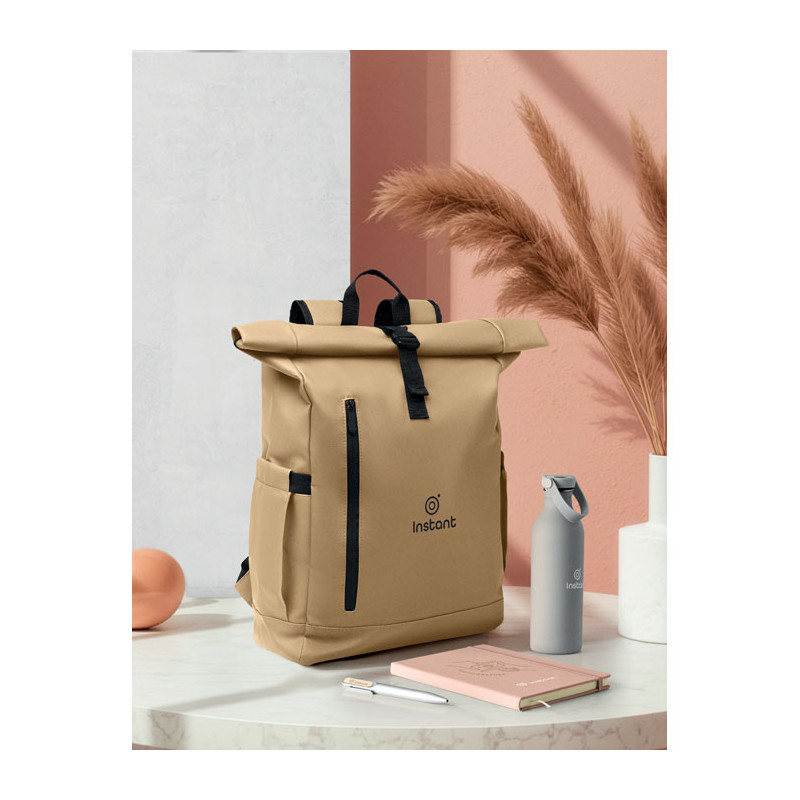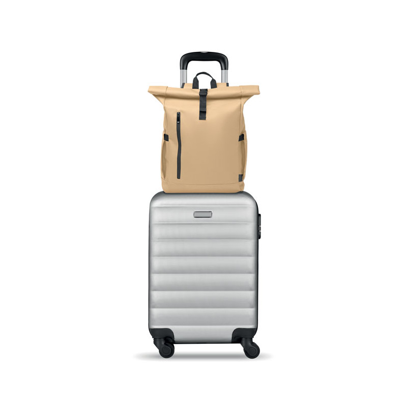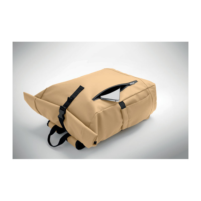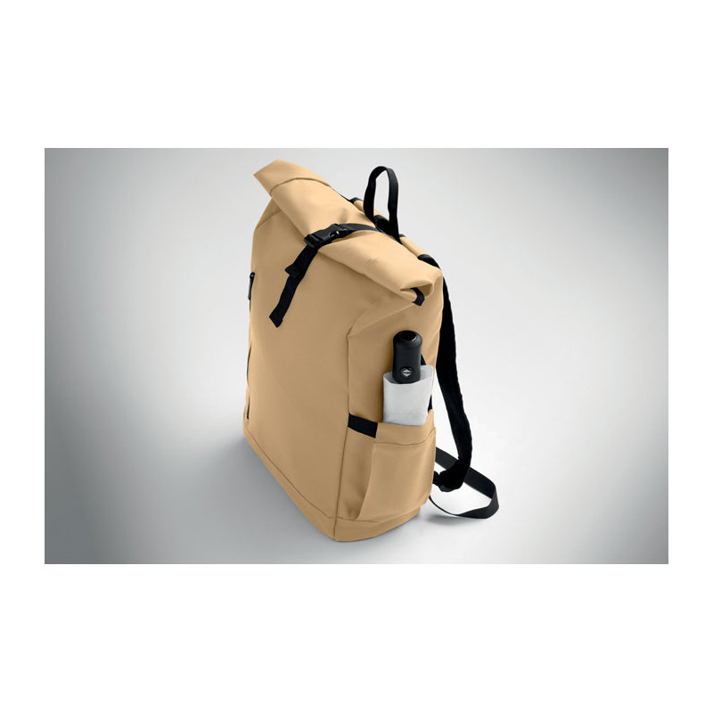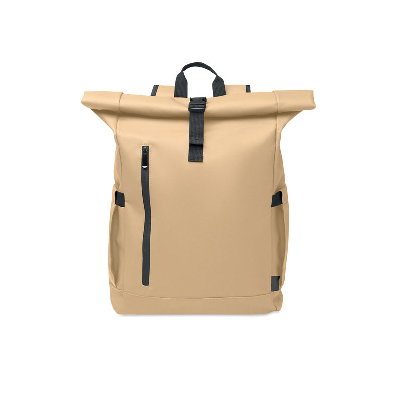 Roll top 15 inch laptop backpack in PU coated 600D RPET polyester and RPET polyester lining. Meshed padded back with zippered pocket and trolley strap. Padded shoulder strap with mesh inside finishing.