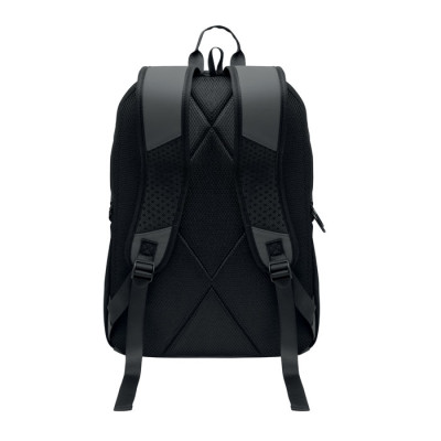 15 inch laptop backpack in soft PU with padded back and hidden zippered main compartment. 1 zippered front pocket, 2 front side zippered pockets and 2 elastic mesh side pockets. With 210D RPET lining.