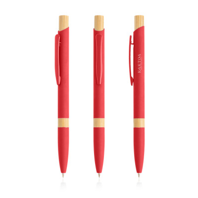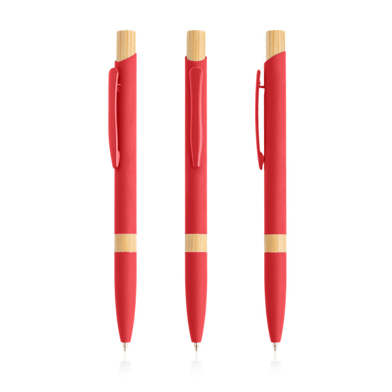Eco-friendly pen in recycled aluminium with bamboo details. Blue ink. Sustainable branded gift ideal for corporate promotions.