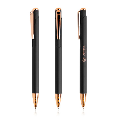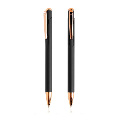 Metal ballpoint pen with rose gold details. A feminine ballpoint pen, with modern and attractive colors. Rose gold details make it stand out and elegant. In laser engraving, your design will match the details. With pulse system. This ballpoint pen is blue writing.