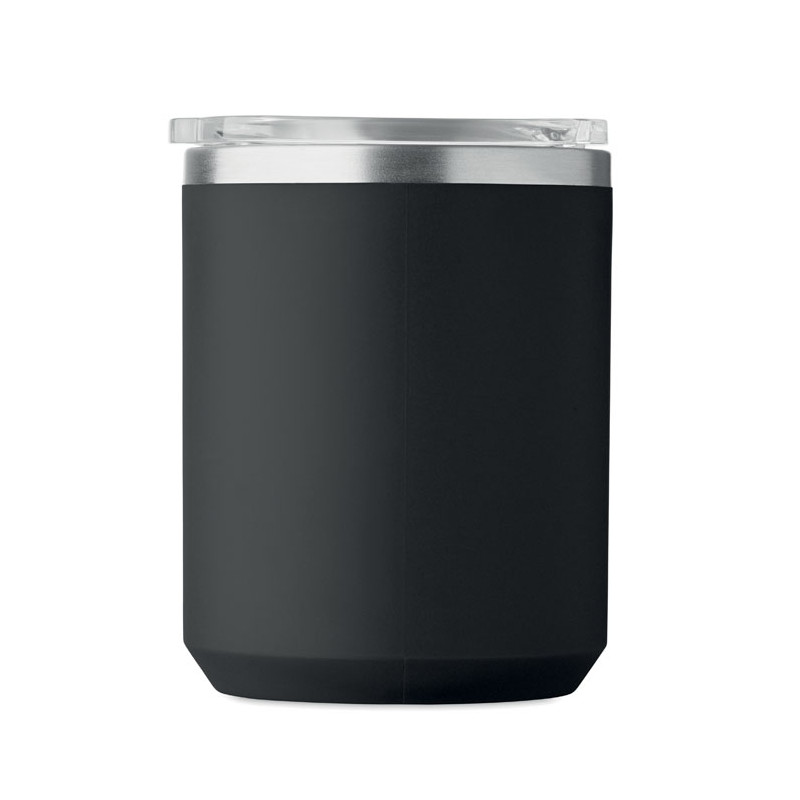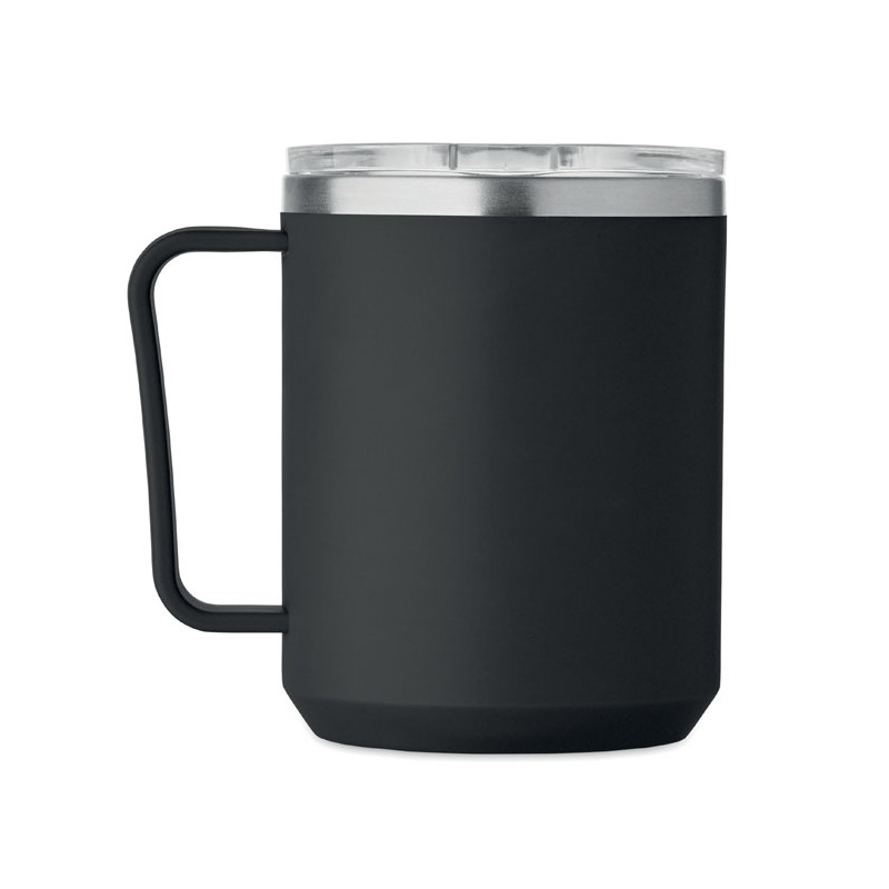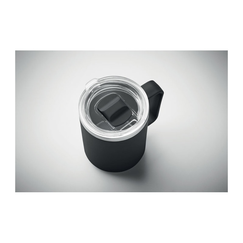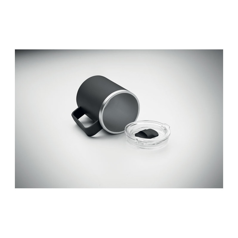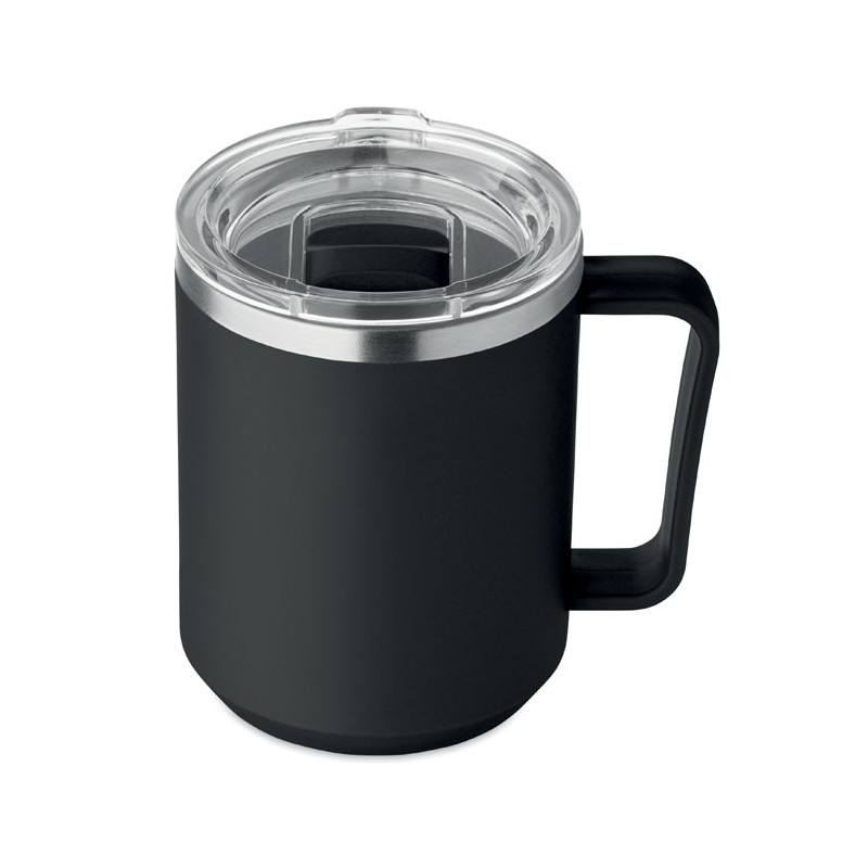 Double wall mug with 90 % recycled stainless steel and 10% stainless steel interior and recycled PP exterior. Includes transparent AS sliding lid. Capacity 400ml.