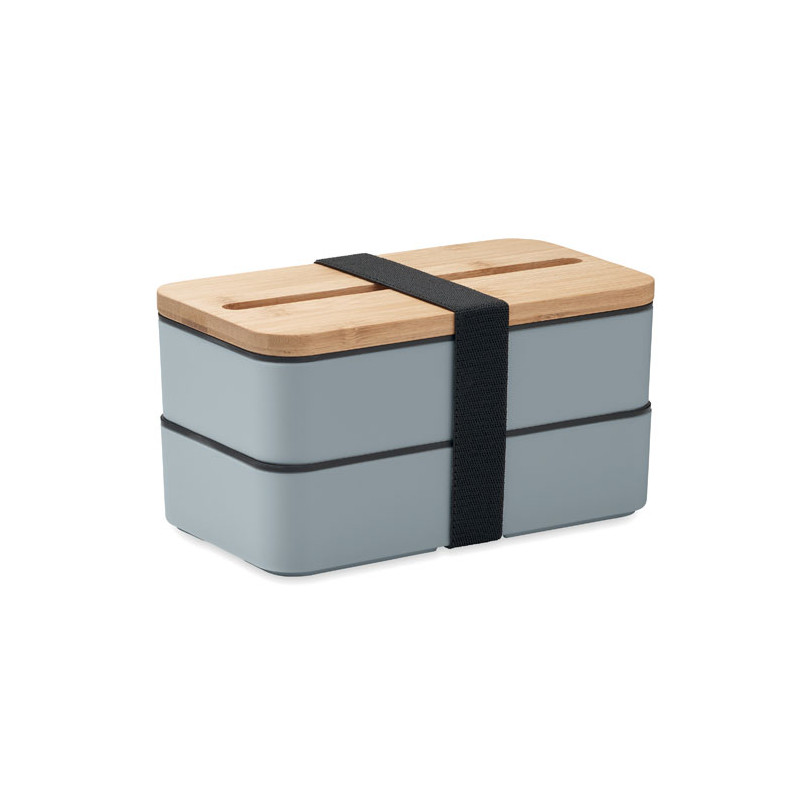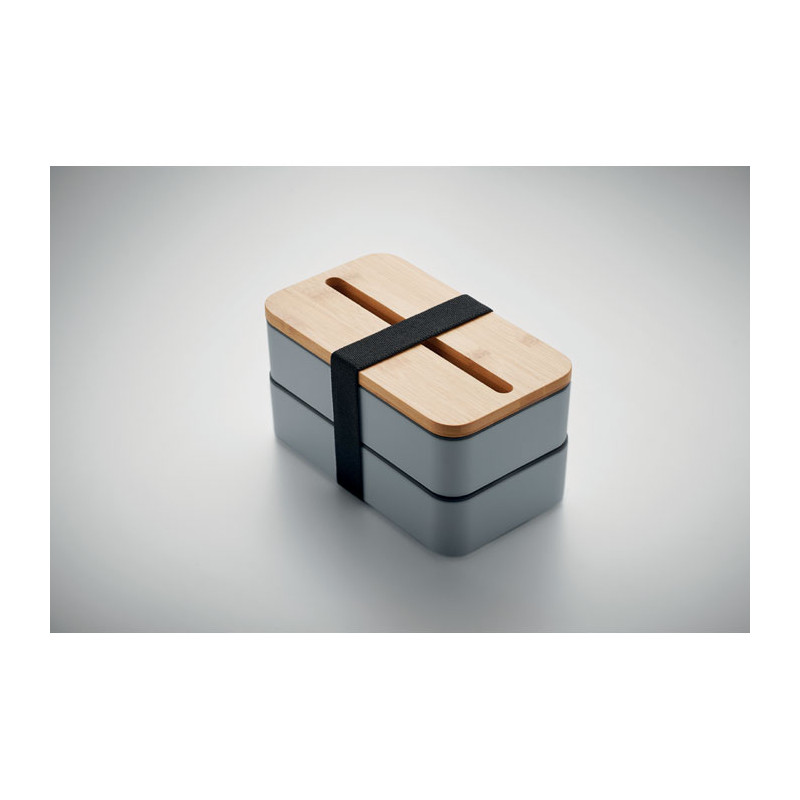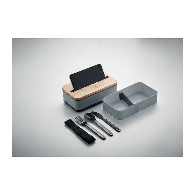 Two-tier lunch box made from recycled PP with a removable separator, 3 pieces of cutlery, and a bamboo lid that also serves as a phone stand. Capacity: 400 ml (2x). Bamboo is a natural material, so the item's color may vary from piece to piece