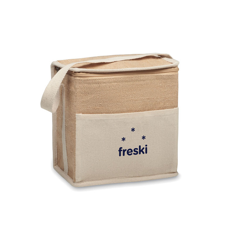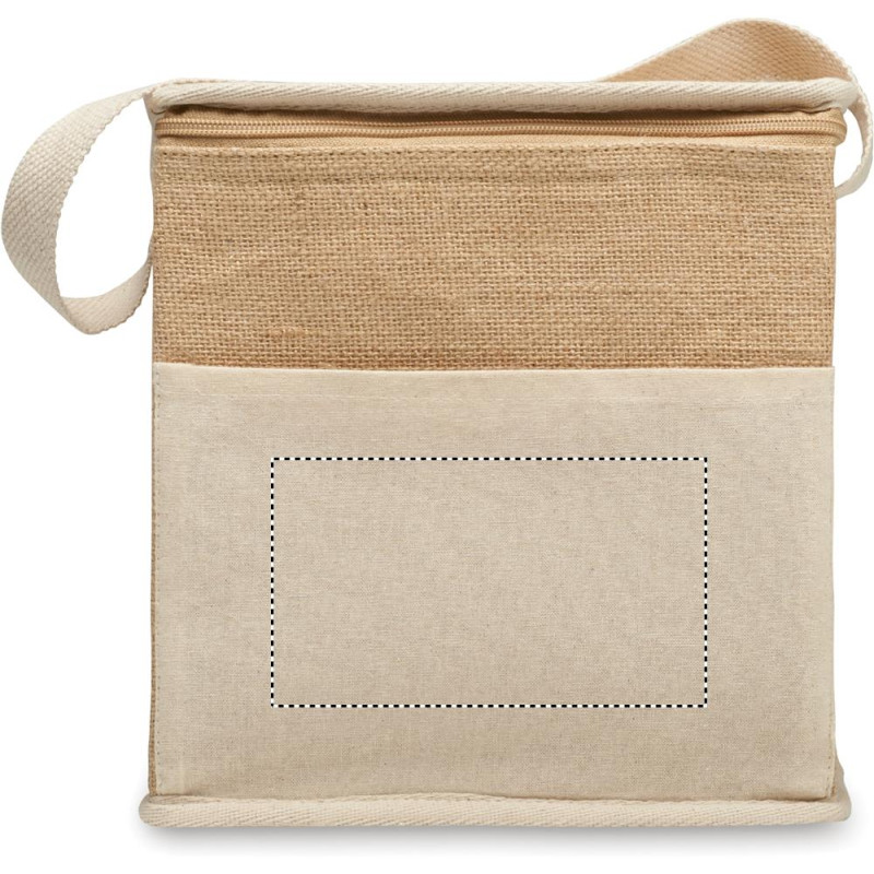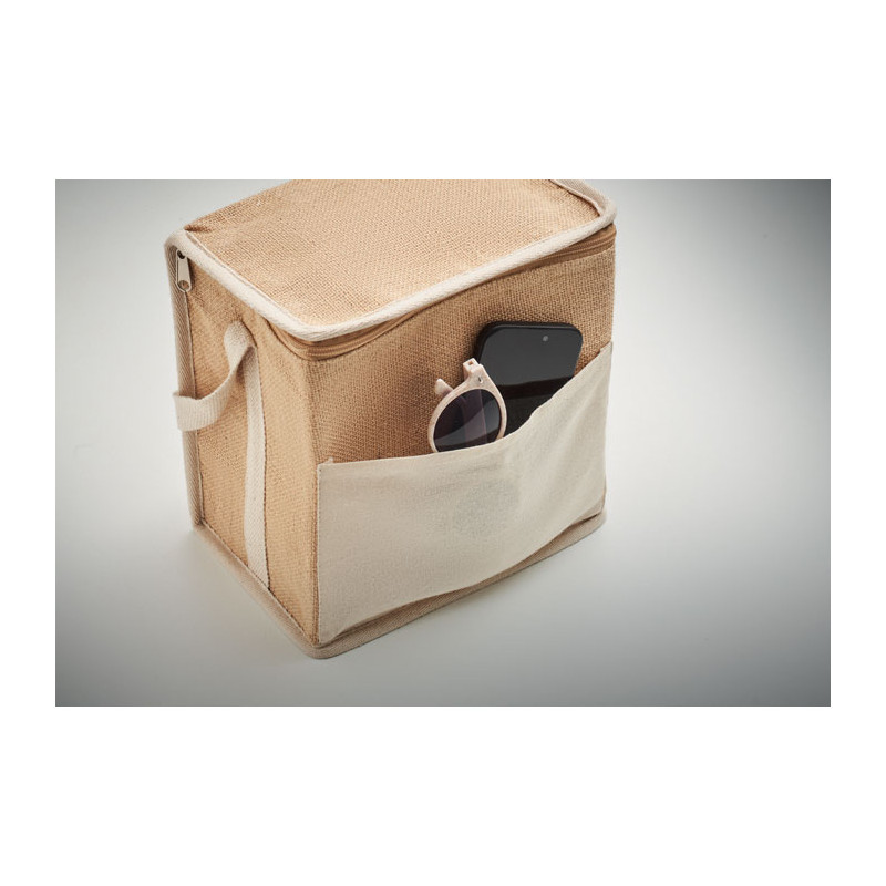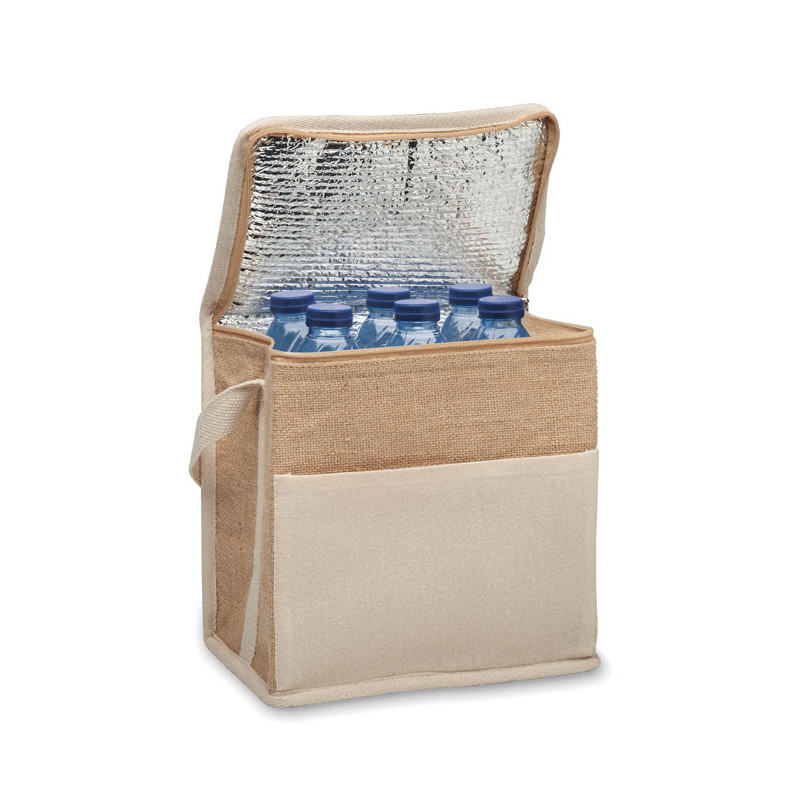 Jute cooler bag with cotton strap and front pocket for 6x0,5 L bottles. Isolation material: 3 mm aluminium foil. Capacity 3L.