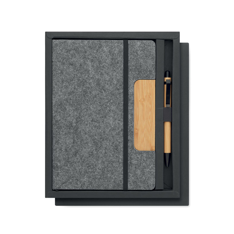 A5 RPET felt hard cover notebook set with phone stand functionality and push ball pen with bamboo barrel. Case bound. 160 recycled paper lined pages (80 sheets). Elastic closure strap. Ribbon bookmark. Blue ink.