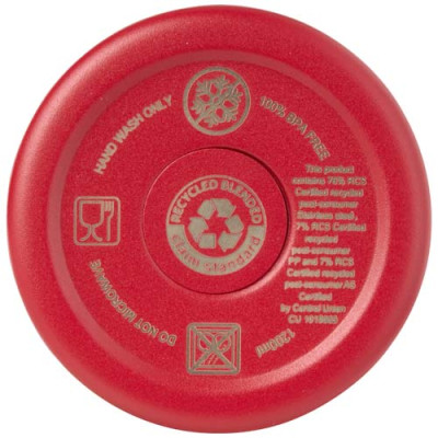 RCS certified double walled copper vacuum insulated tumbler, constructed using 91% post-consumer recycled stainless steel that will keep drinks cold for at least 24 hours, or hot for 9 hours. Features a Tritan straw, and a lid slider function to prevent spills. The 100% recycled plastic press-on swivel lid securely holds the straw in place, and can easily be rotated to expose the drink opening. Durable exterior powder coating. Volume capacity: 1200 ml. Hand wash only.