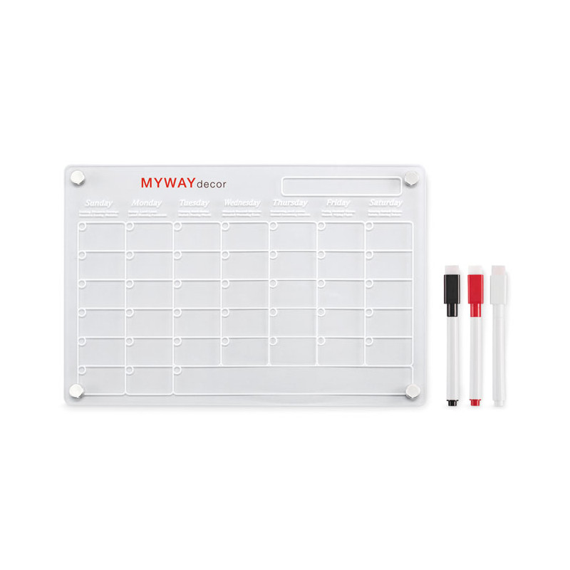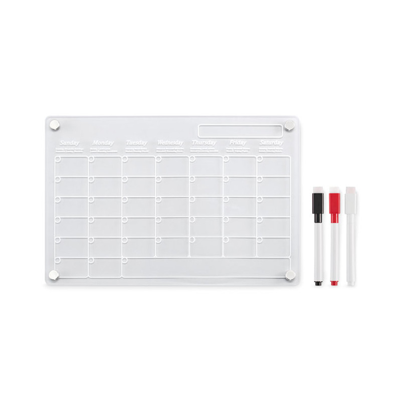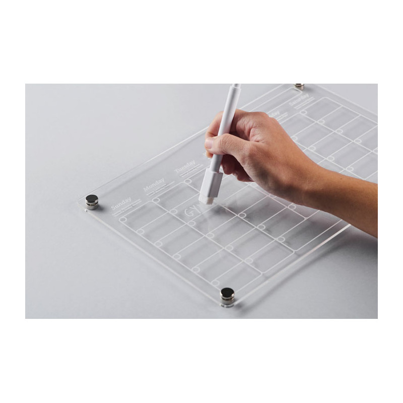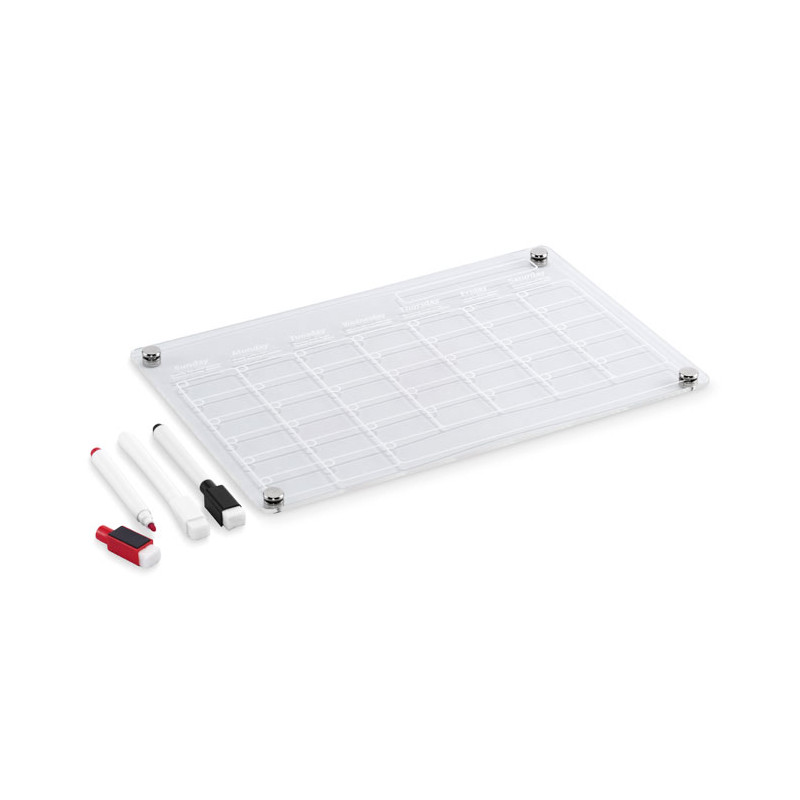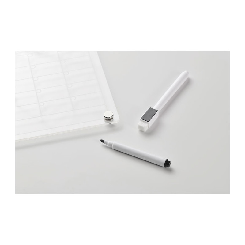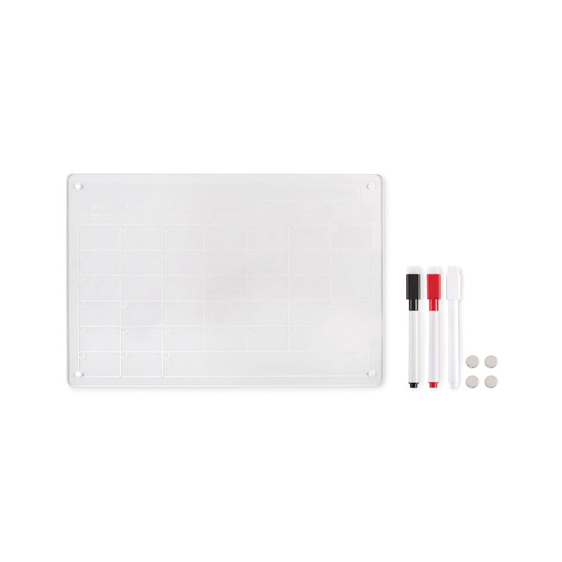 Magnetic acrylic monthly planner in A4 size with 3 erasable magnetic markers (black, red and white). Includes screws for mounting.