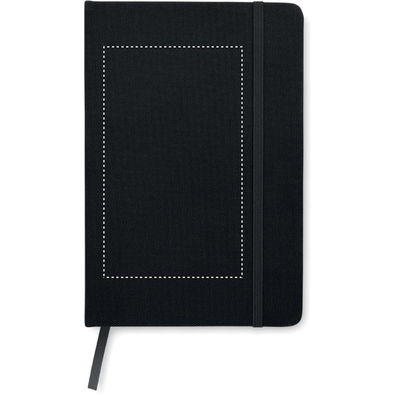 A5 notebook with 600D RPET hard cover and 80 lined recycled paper pages with an elastic band and page marker ribbon.