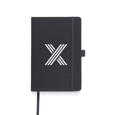 A5 RPET notebook with ballpoint holder. A classic block in a modern and eco-friendly material. This pad has 160 70g pages with paper sourced from responsibly managed forests, a ribbon, an elastic band and a ballpoint holder. All details in the same color as the cover. A gift that is always useful and, now, more environmentally friendly.