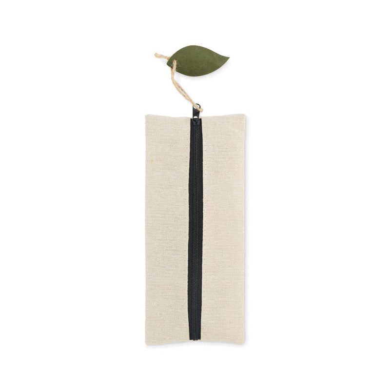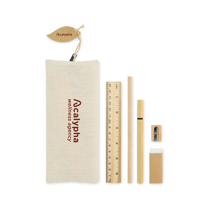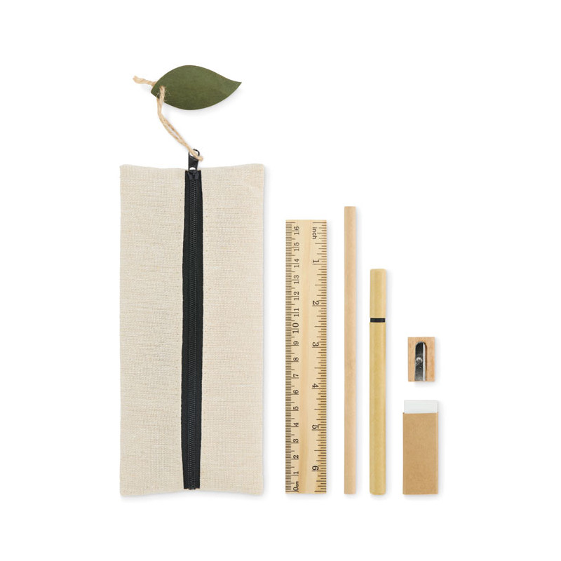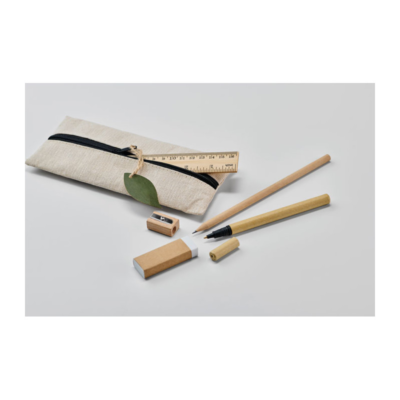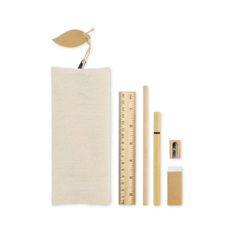 Stationery set in jute and cotton pouch including wooden 15cm ruler, wooden pencil, paper barrel ballpen, eraser and wooden sharpener. Natural look and reusable pouch.