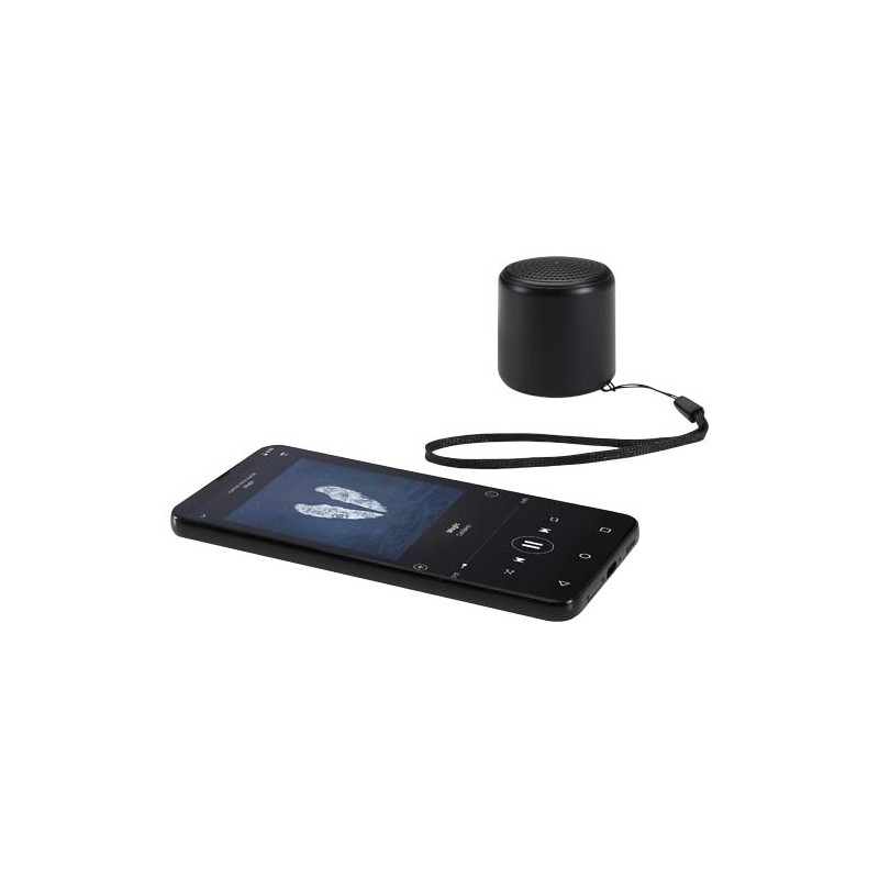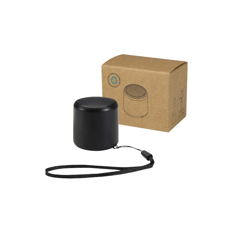 Speaker made from recycled plastic, ideal for those seeking high-tech sustainable personalized gifts. Lightweight and with a wrist strap, it is one of the most modern promotional gifts for eco-friendly campaigns.