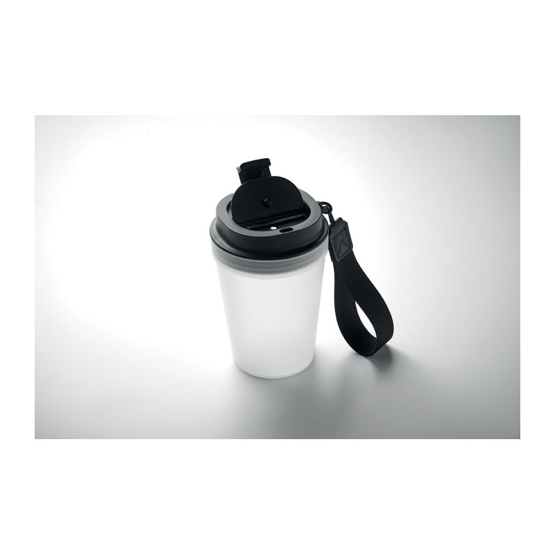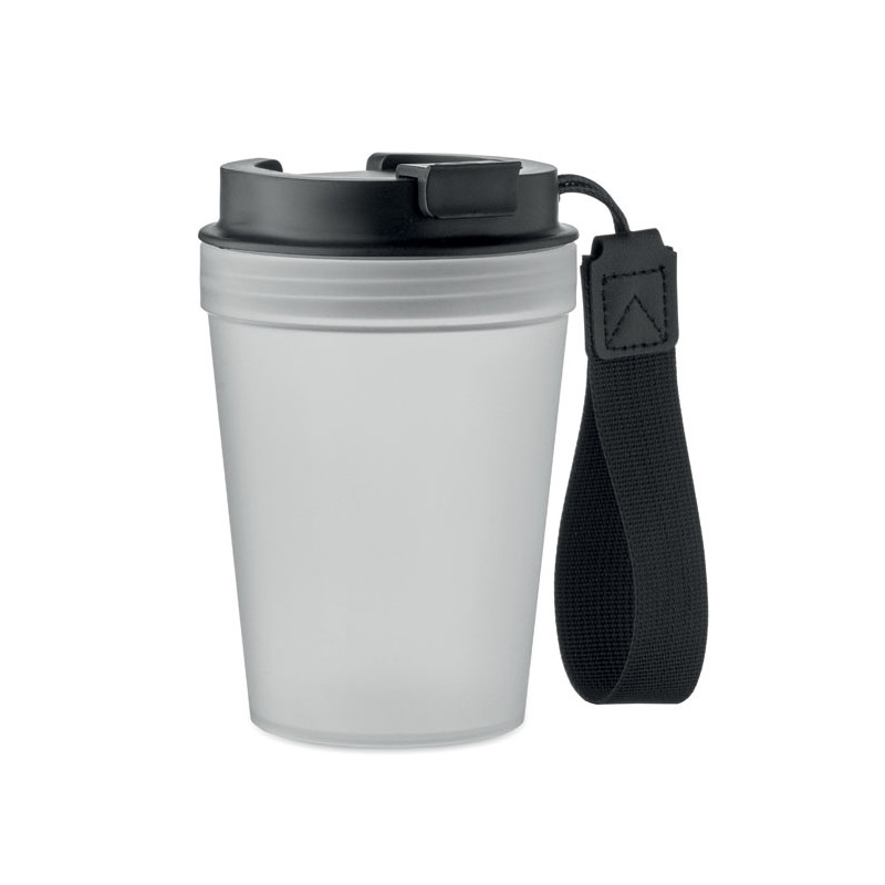 Single wall tumbler in PP, with RPET polyester strap. Leak-free. Capacity: 300 ml. As this is a single walled tumbler, heat transfer can still occur.