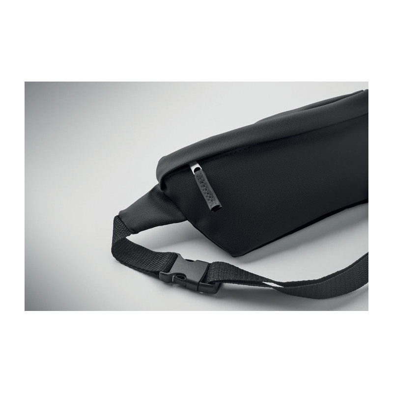 Waist bag in recycled RPET 600D. Sustainable promotional gift with logo, ideal for corporate merchandising and eco-conscious brand promotion.