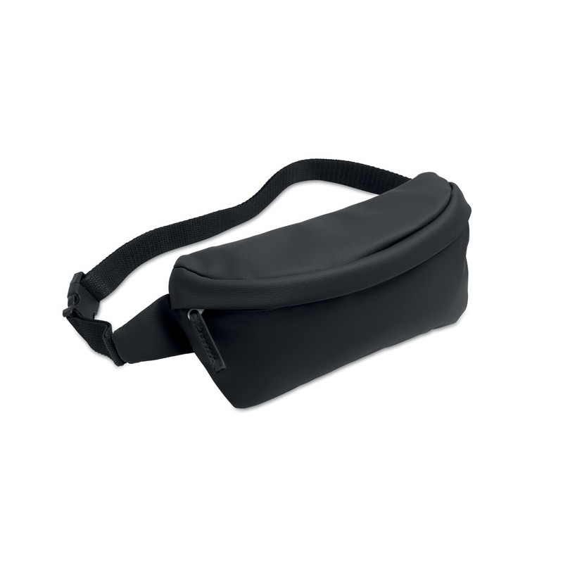 Waist bag with PU coated 600D RPET polyester, 210D RPET polyester lining and front zippered pocket.