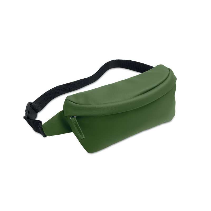 Waist bag with PU coated 600D RPET polyester, 210D RPET polyester lining and front zippered pocket.