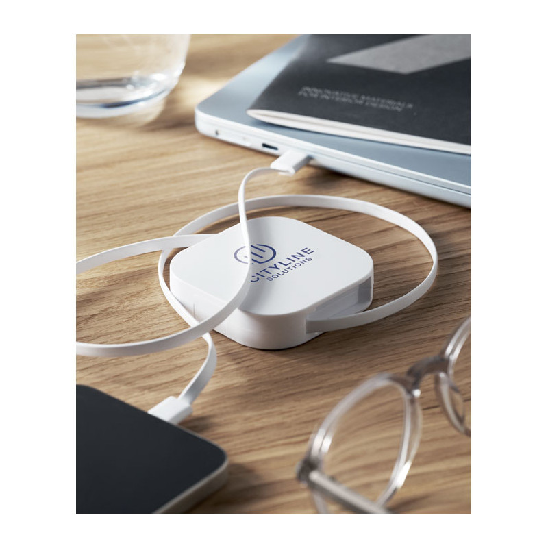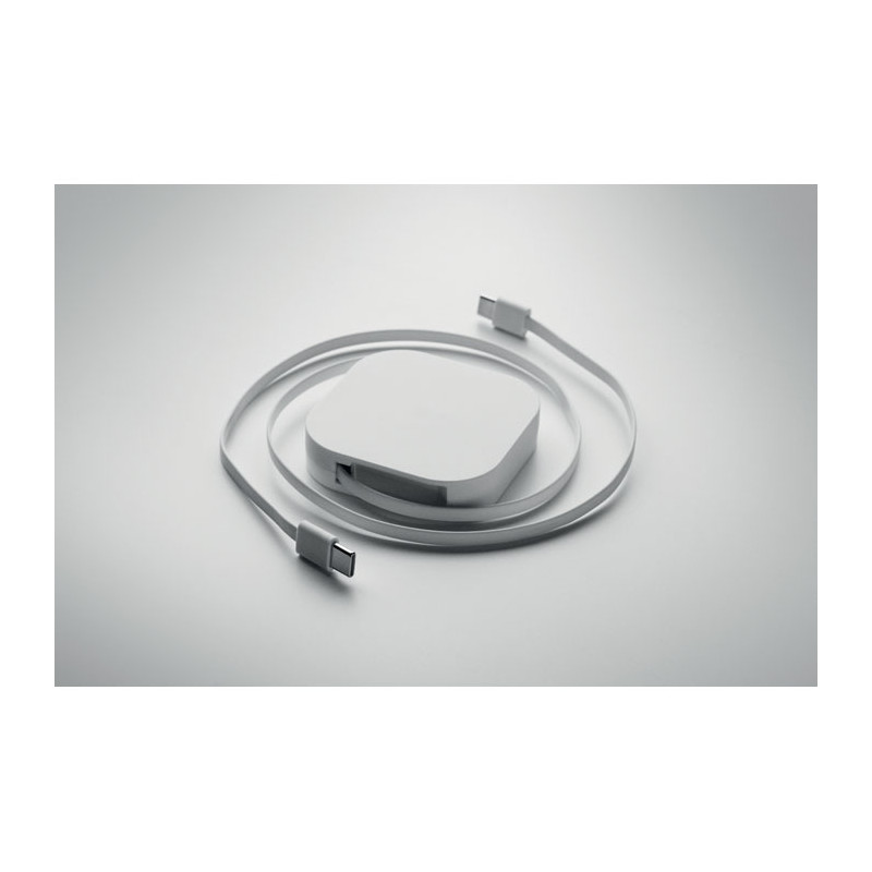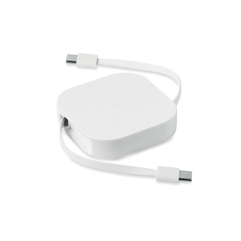 Cabo de dados e de carregamento retrátil de 100 W. Inclui suporte para telemóvel. Cabo em PVC com caixa em ABS para alimentação e transferência de dados (480 Mbps). Ligação de tipo C a tipo C.