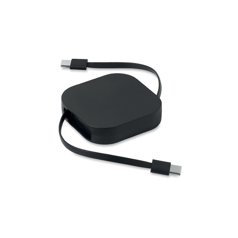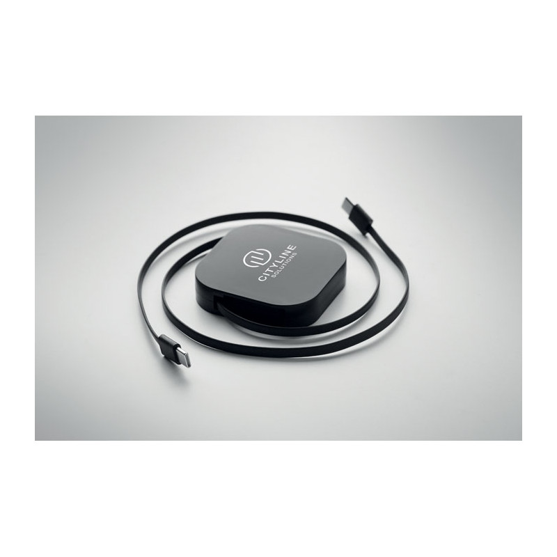 Cabo de dados e de carregamento retrátil de 100 W. Inclui suporte para telemóvel. Cabo em PVC com caixa em ABS para alimentação e transferência de dados (480 Mbps). Ligação de tipo C a tipo C.