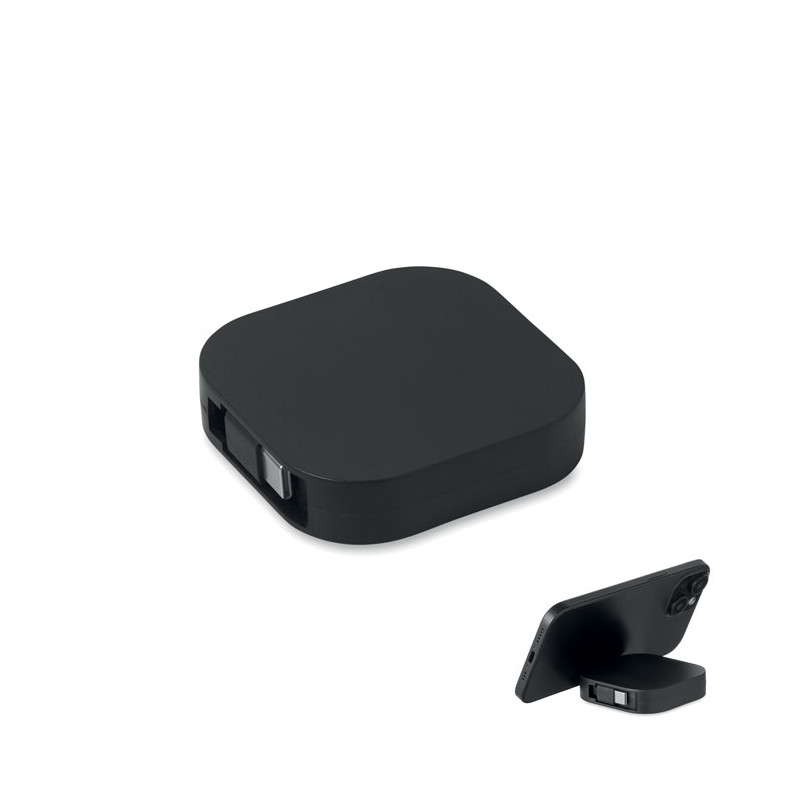 Cabo retrátil para carregamento rápido e dados com suporte para telemóvel integrado. O gadget premium indispensável para brindes publicitários tecnológicos e inovadores.