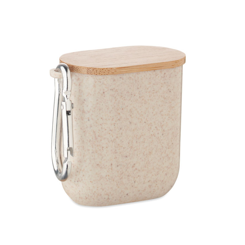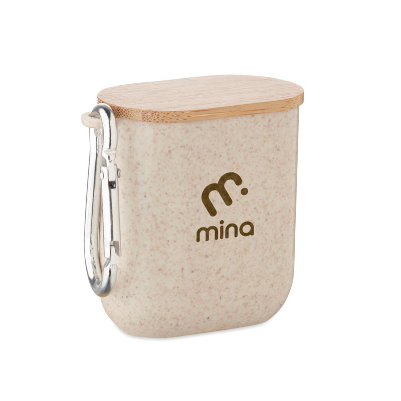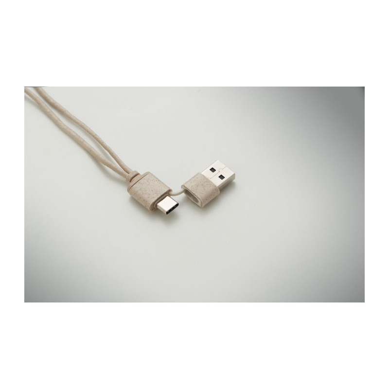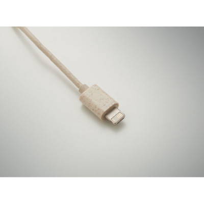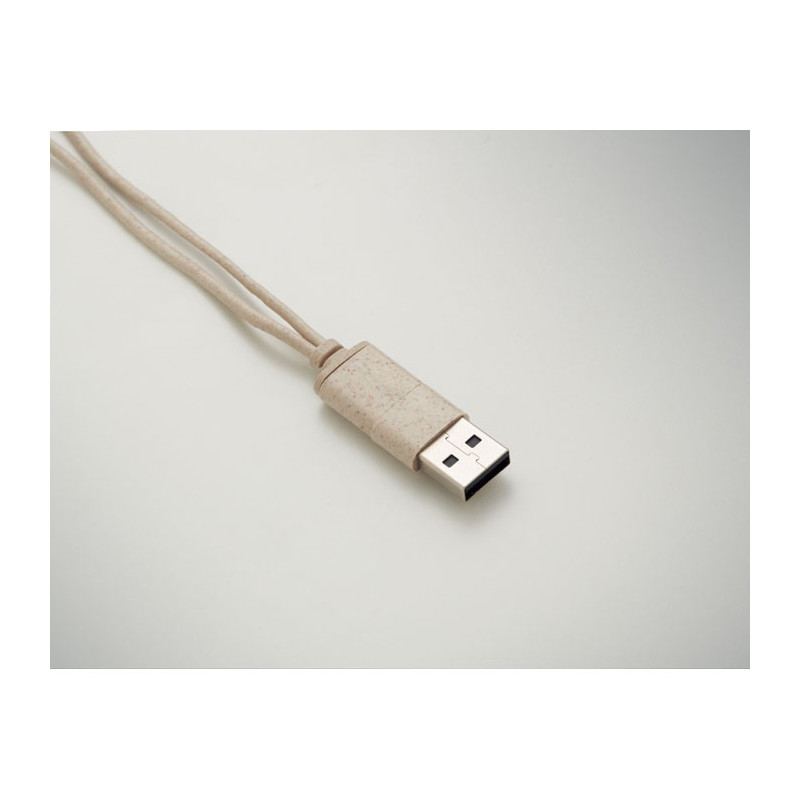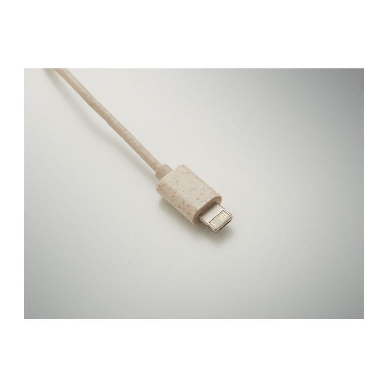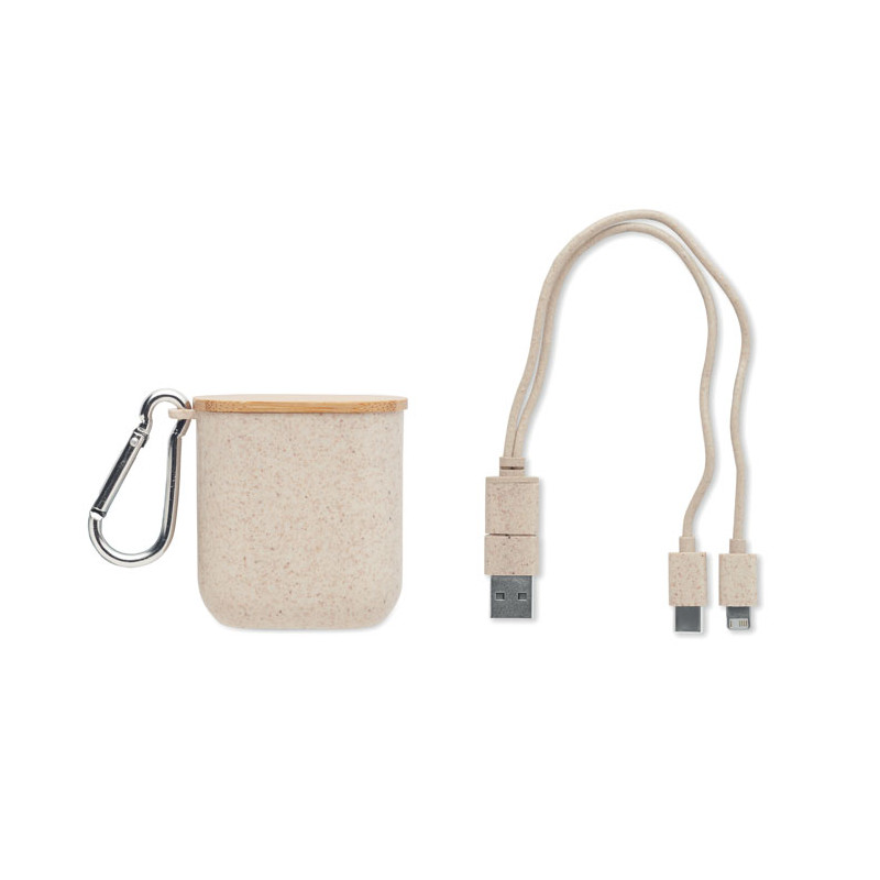Conjunto de cabos em caixa de palha de trigo/ABS, tampa de bambu e mosquetão. A tampa serve de suporte para o móvel (na posição horizontal). Entrada do cabo 2em1 USB-C/A, saída Tipo C e 2 em 1 pinos.