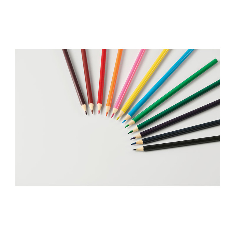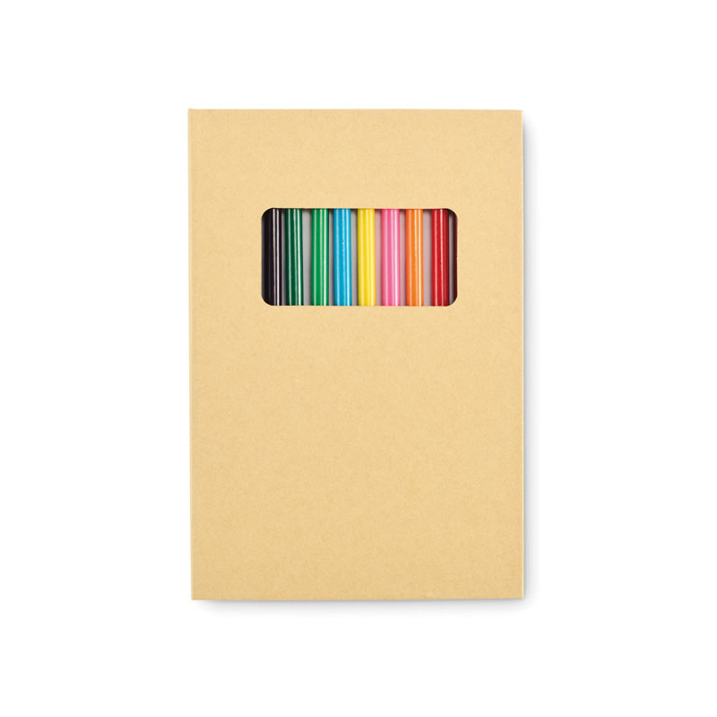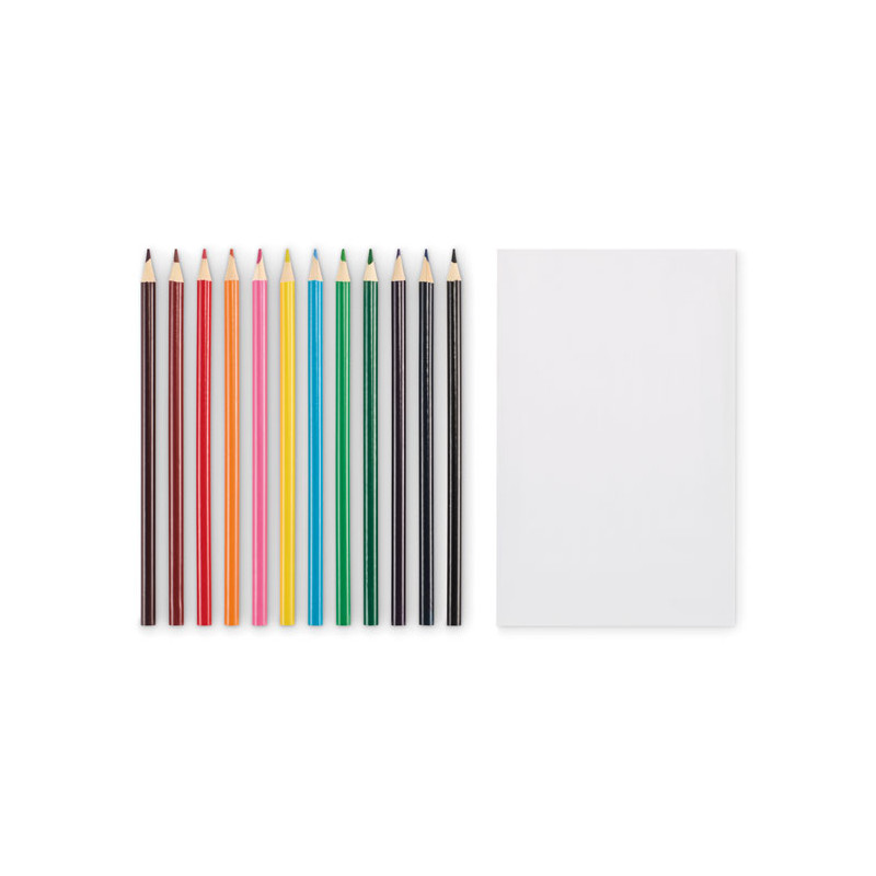 Conjunto de desenho para crianças com 50 folhas de papel reciclado e 12 lápis de cor de madeira. Com capa em papel kraft.