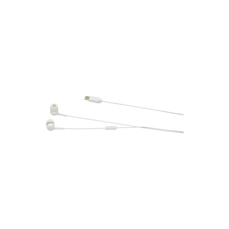 Auriculares tipo C com fios, som de alta qualidade e microfone integrado para chamadas mãos-livres. Entregue numa caixa de armazenamento elegante feita de plástico reciclado.