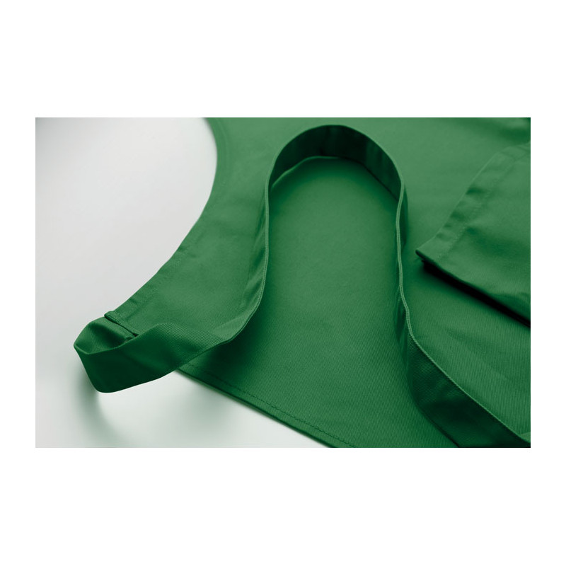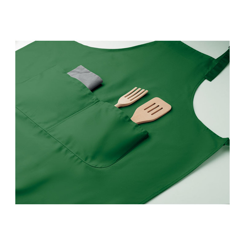 Avental de cozinha comprido e ajustável em polycotton de 240 gr/m² (35% algodão, 65% poliéster) com dois bolsos frontais e alça ajustável com fivela metálica.