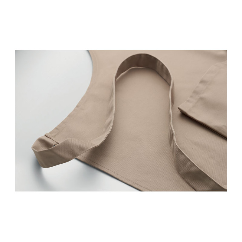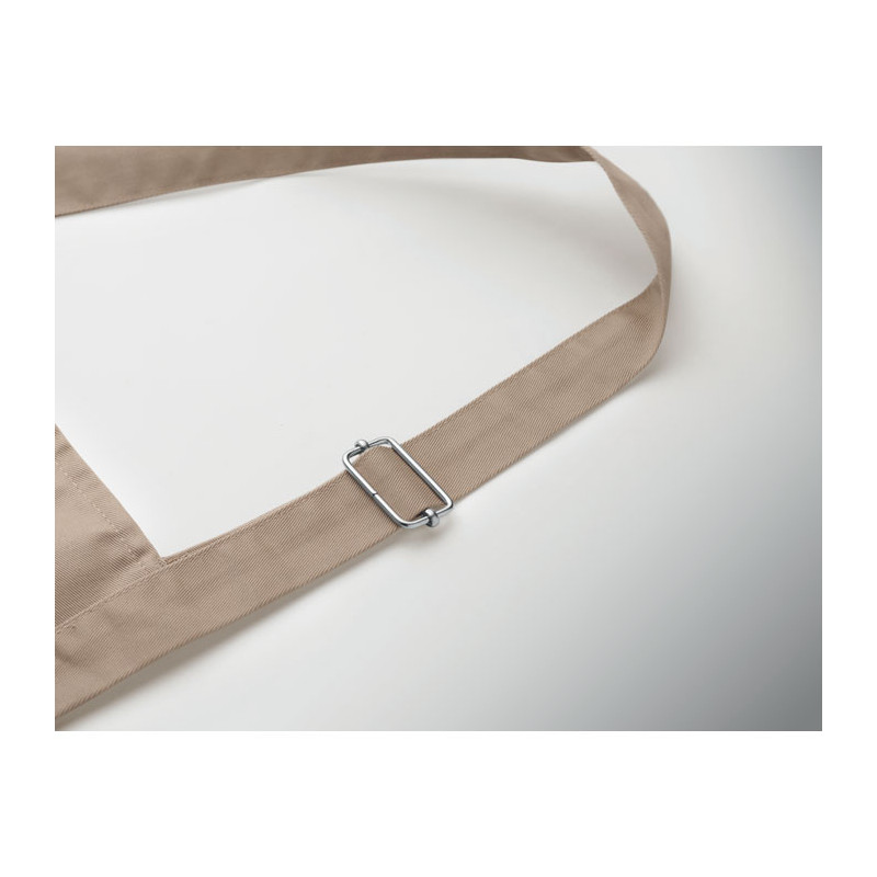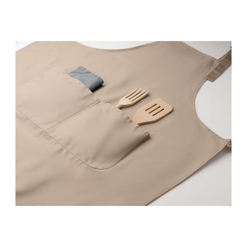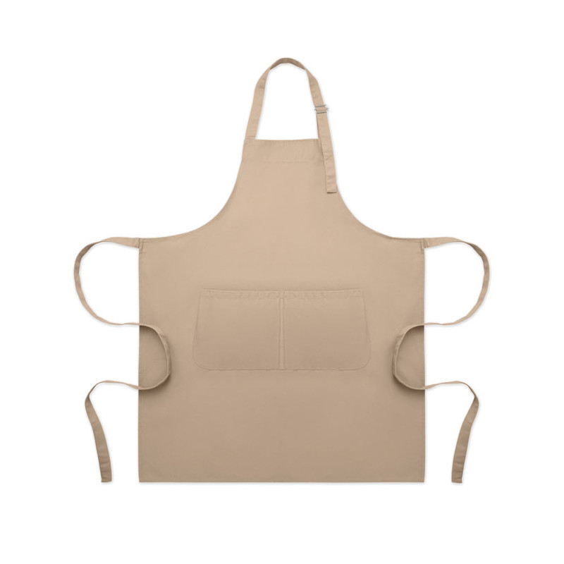 Avental de cozinha comprido e ajustável em polycotton de 240 gr/m² (35% algodão, 65% poliéster) com dois bolsos frontais e alça ajustável com fivela metálica.