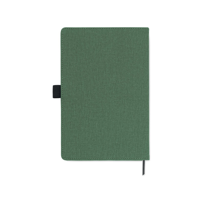Bloco A6 com capa em canvas, 96 folhas pautadas, espaço para caneta, fita elástica e marcador. Brinde corporativo personalizado, funcional e prático.