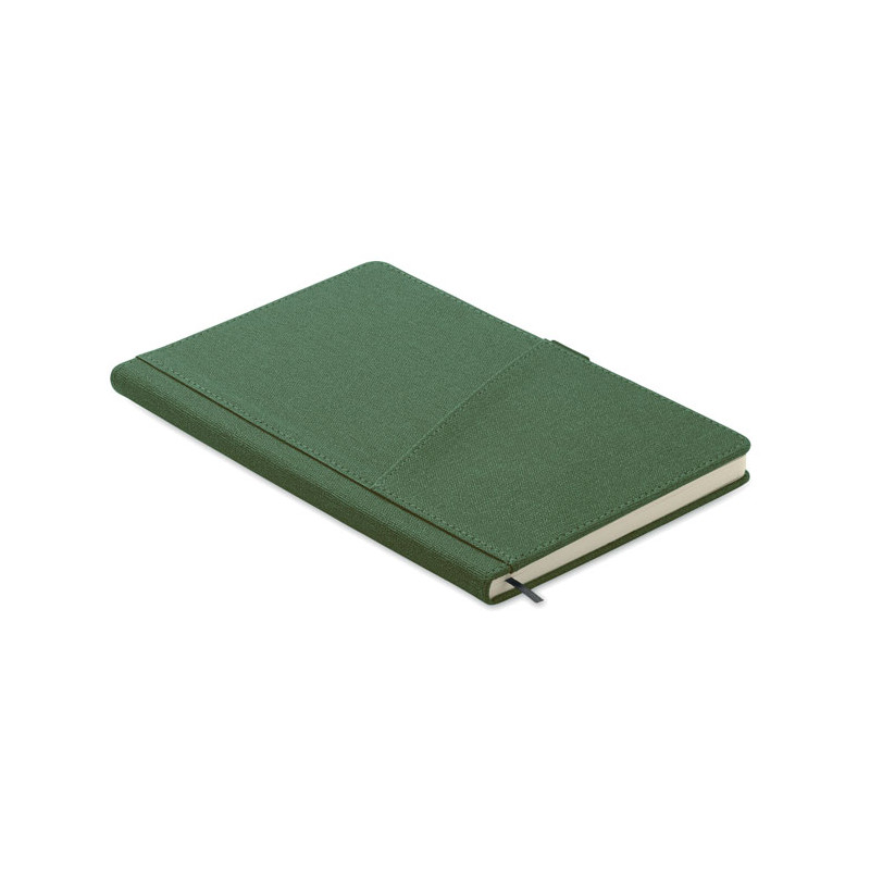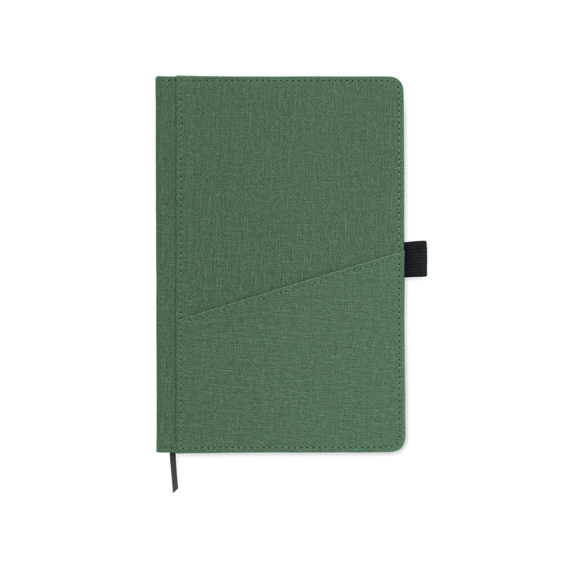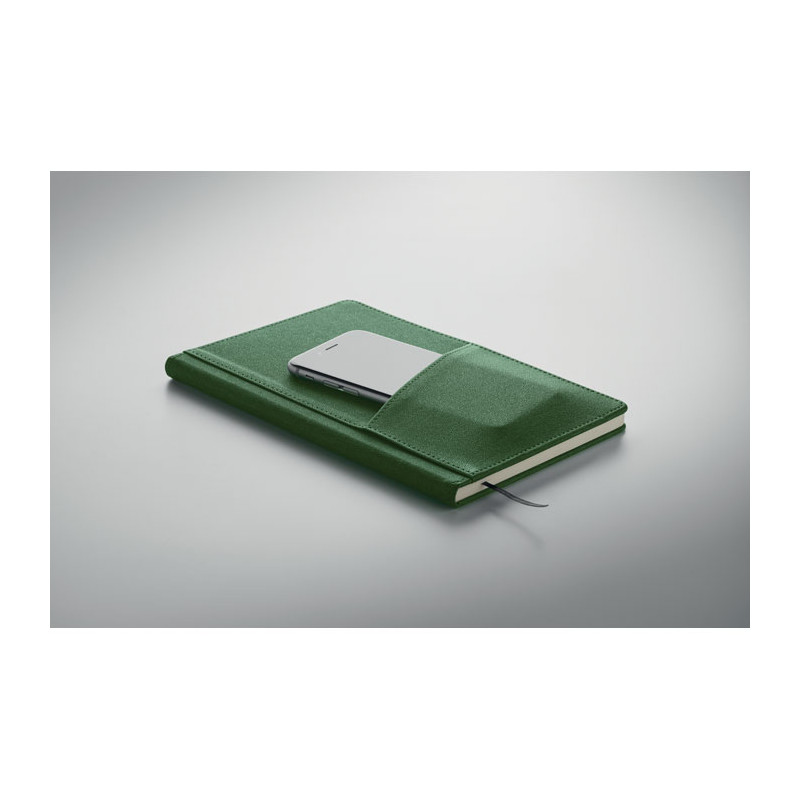 Bloco de notas A5 com capa dura em PU e bolso frontal para telemóvel.160 páginas pautadas em papel reciclado (80 folhas). Marcador de livros com fita a condizer.