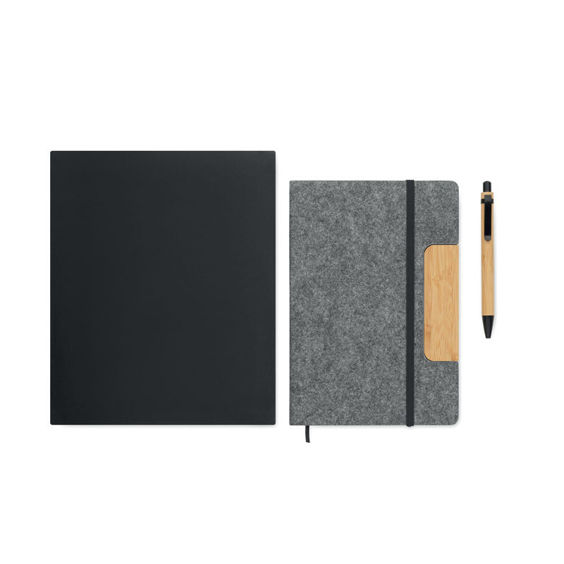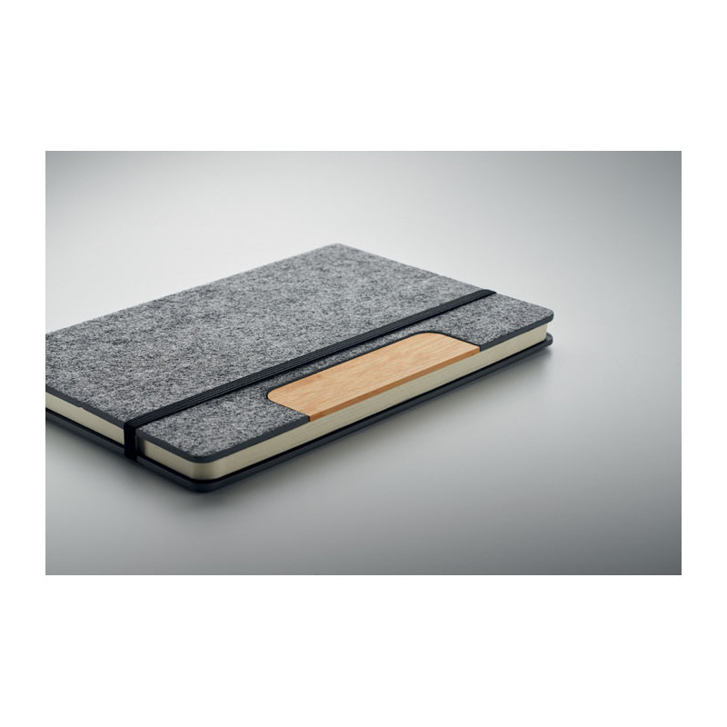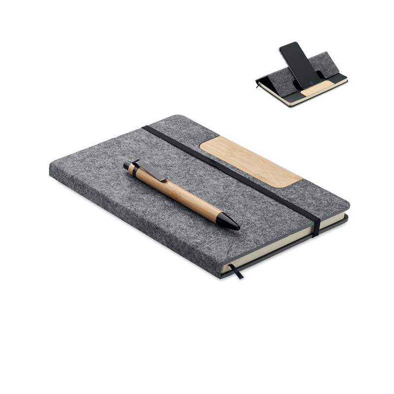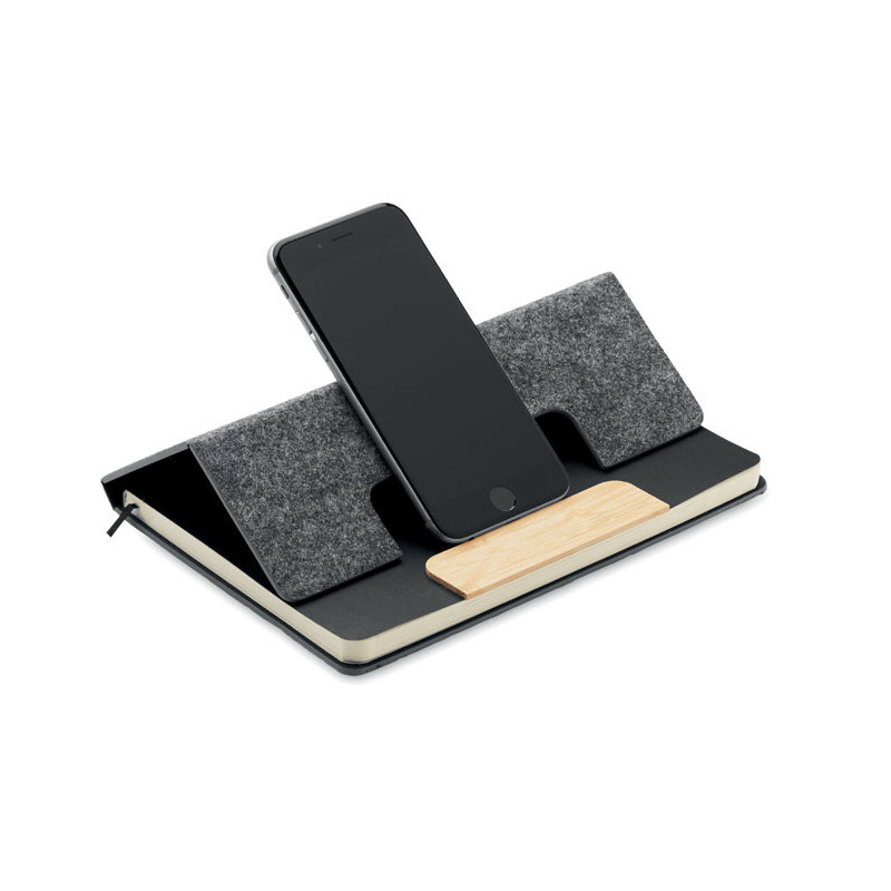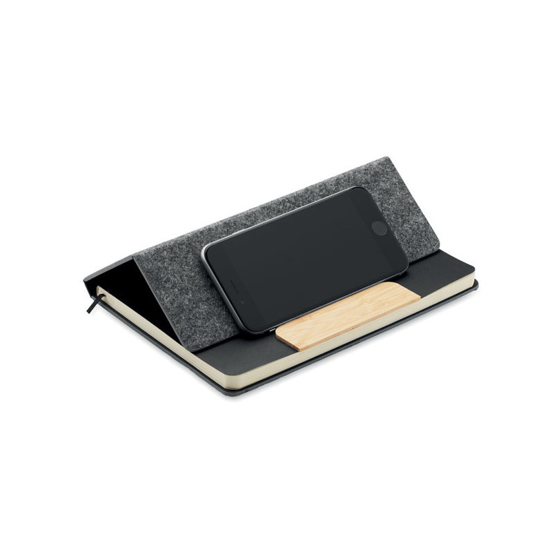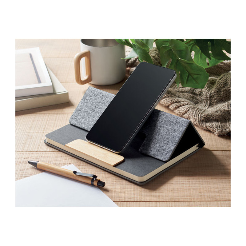 Caderno A5 em feltro RPET com capa dura e suporte para telemóvel. O brinde personalizado sustentável que une organização e tecnologia com total conforto e visibilidade.