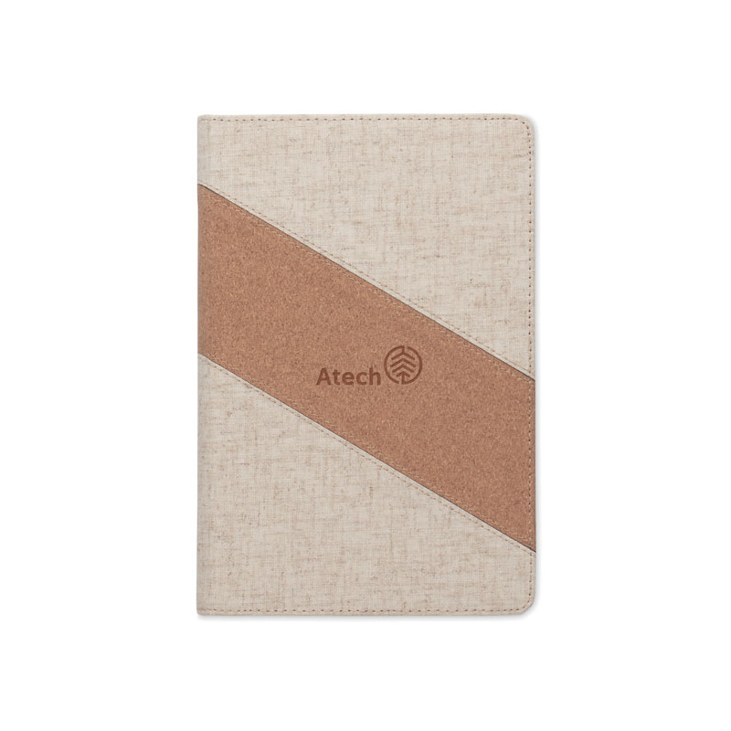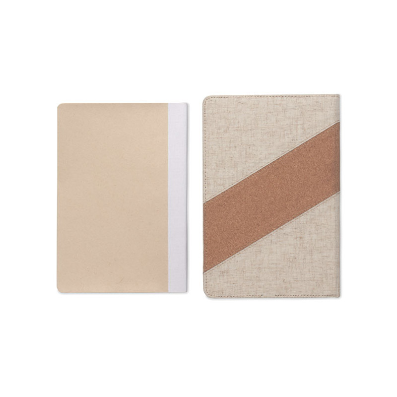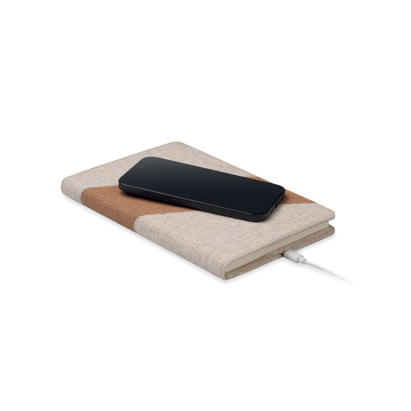 Bloco de notas A5 em 2 em 1 com carregador sem fios integrado de 15 W. Com pormenores em algodão e cortiça na capa, 128 folhas pautadas (64 folhas). Marcador de livros com fita.