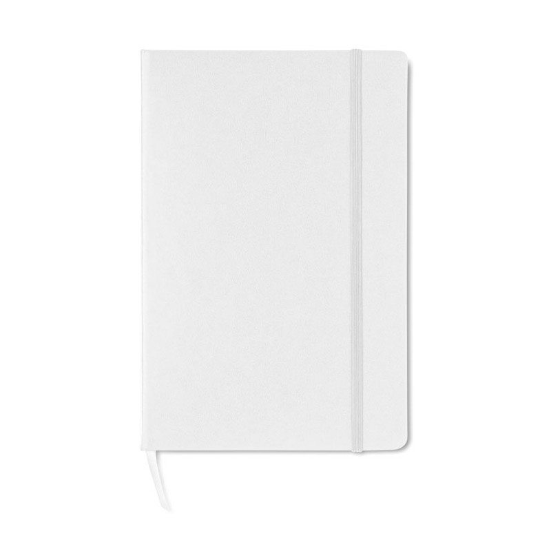 Bloco de notas A5 com capa em PVC rígido. Encadernação em caixa. 192 páginas quadradas em papel reciclado (96 folhas). Alça de fecho elástica e marcador de livros com fita a condizer.