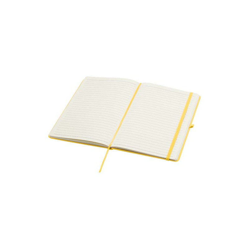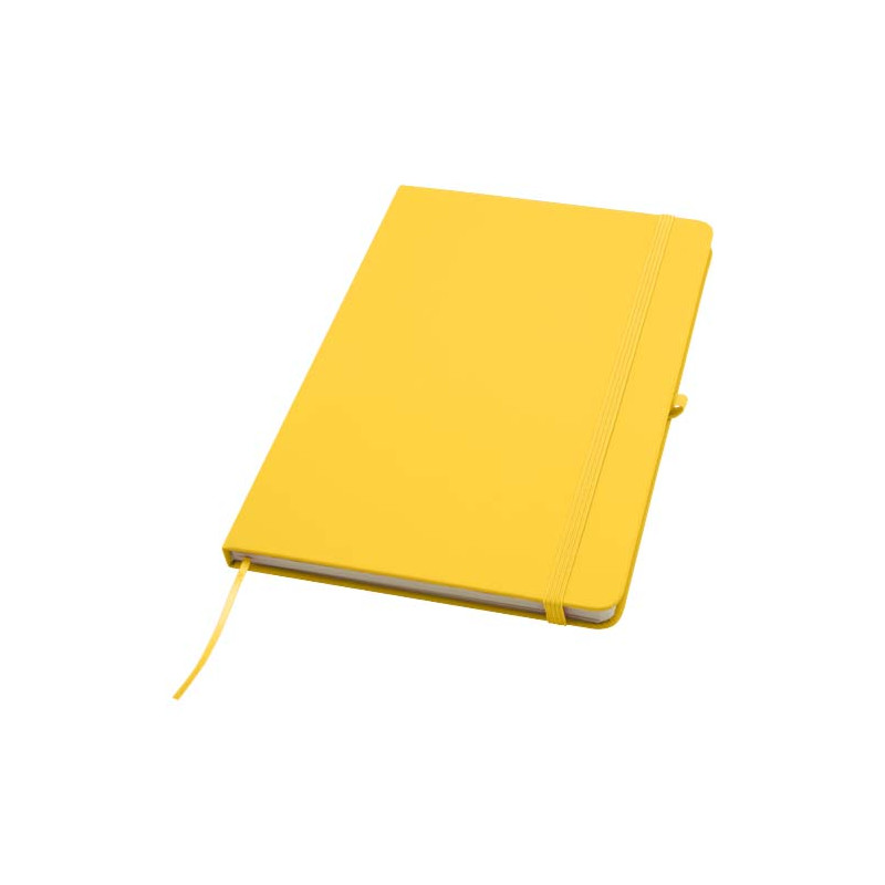 O bloco de notas de capa dura A5 "Spectrum Plus" com cantos arredondados não é apenas um artigo essencial para o escritório, mas também uma ótima oportunidade para promover a sua marca. O bloco de notas de cartão tem uma capa macia e 80 folhas pautadas de cor creme de 70 g/m², ideal para anotar ideias rápidas ou escrever notas longas. O bloco de notas tem uma alça para caneta, um fecho elástico, um marcador de fita e um bolso sanfonado.