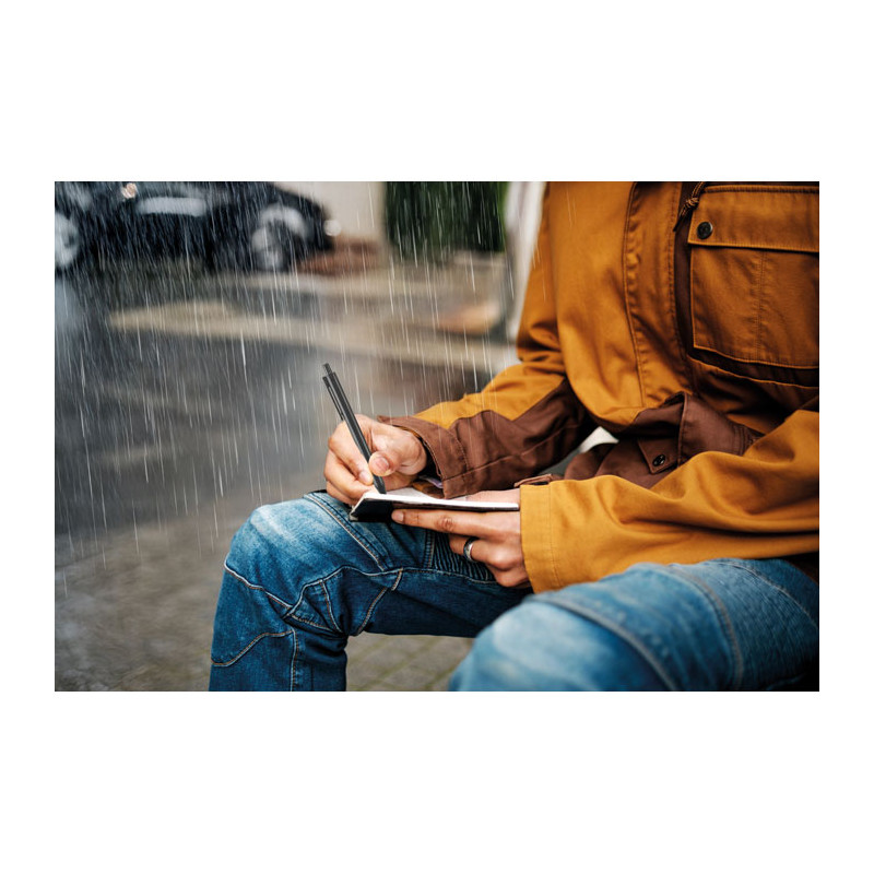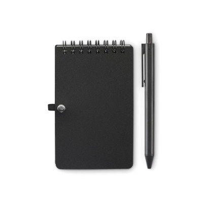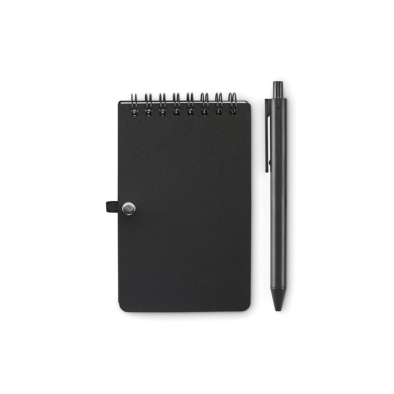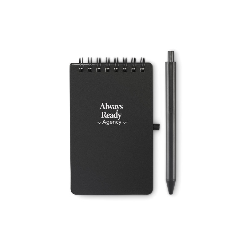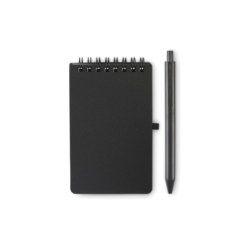 Caderno repelente de água em capa PP com caneta. Fio duplo. Papel mineral 120 gr/m², 50 folhas pautadas. Tinta azul. Alça elástica de fecho e suporte para caneta.