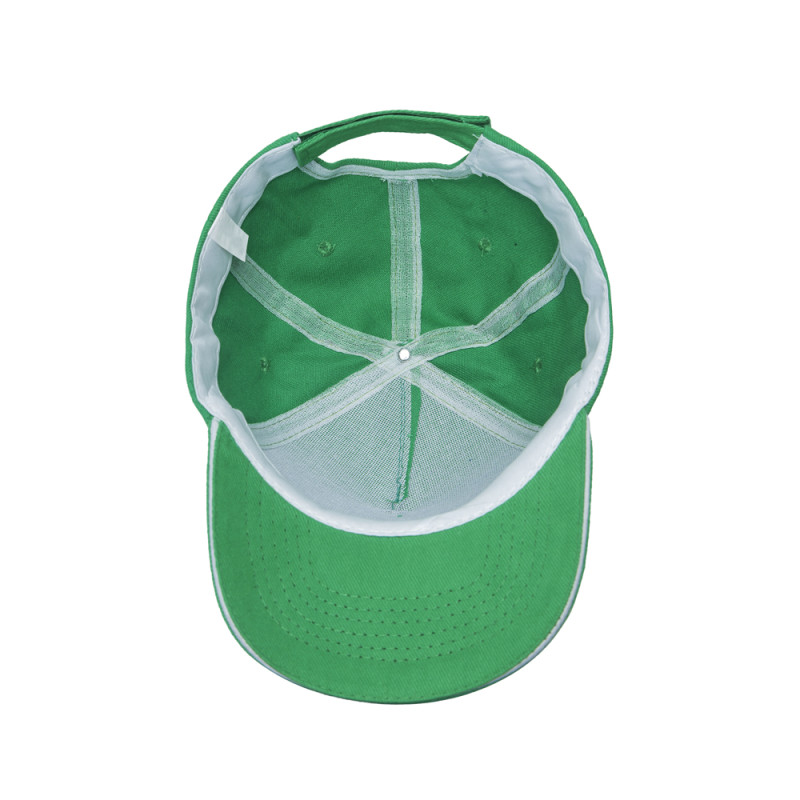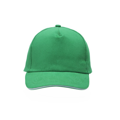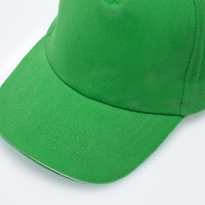 Boné para adulto, pala sandwich, de algodão penteado. Este boné de cinco painéis conta com um fecho de velcro ajustável e um detalhe contrastante na pala. Painel frontal ideal para gravação.