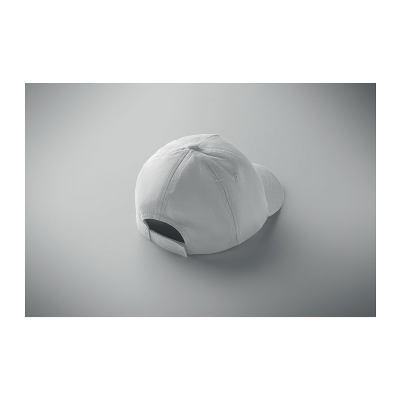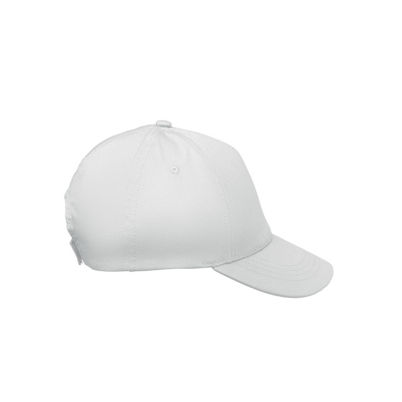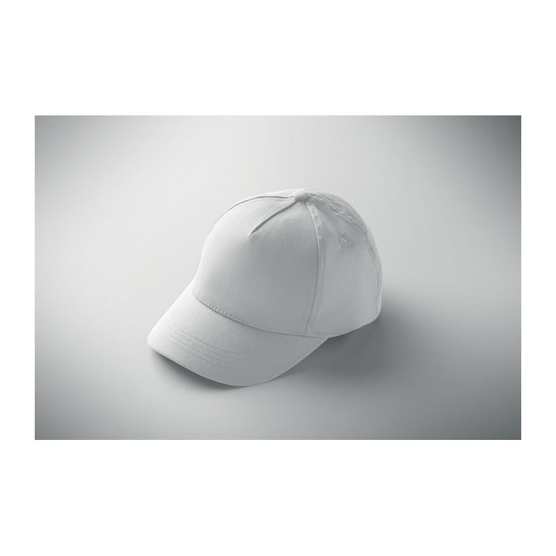 Boné infantil de 5 painéis em sarja de algodão para brindes personalizados. Com fecho em velcro ajustável, é o brinde publicitário ideal para escolas, eventos infantis e desporto.