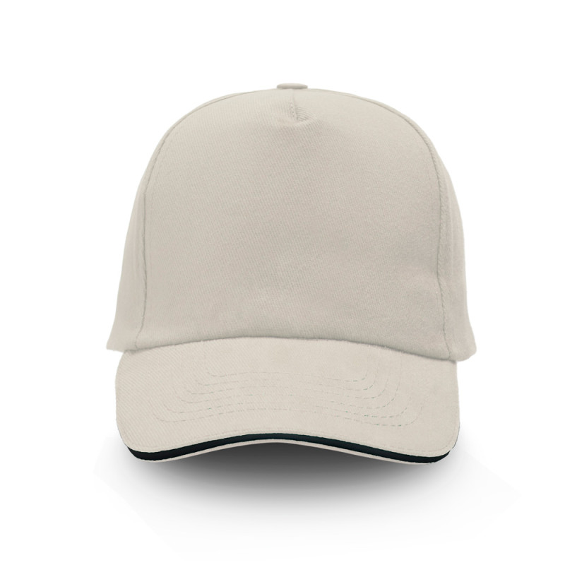 Boné para adulto, pala sandwich, de sarja de algodão. Este boné de cinco painéis conta com um fecho metálico ajustável e um detalhe contrastante na pala. Painel frontal ideal para gravação.