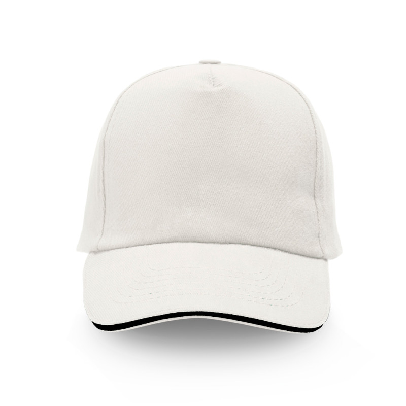 Boné para adulto, pala sandwich, de sarja de algodão. Este boné de cinco painéis conta com um fecho metálico ajustável e um detalhe contrastante na pala. Painel frontal ideal para gravação.