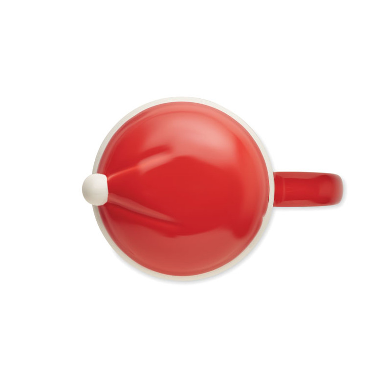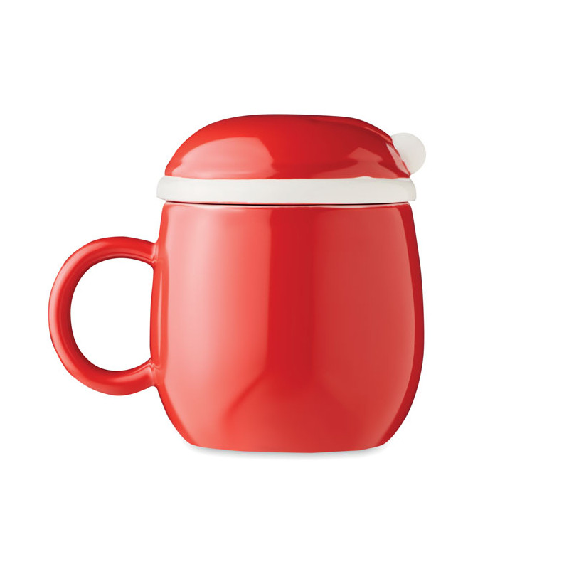 Caneca de cerâmica com tampa de Pai Natal. Brinde promocional natalício personalizado, ideal para oferecer a clientes ou colaboradores com o logotipo.