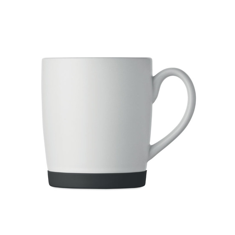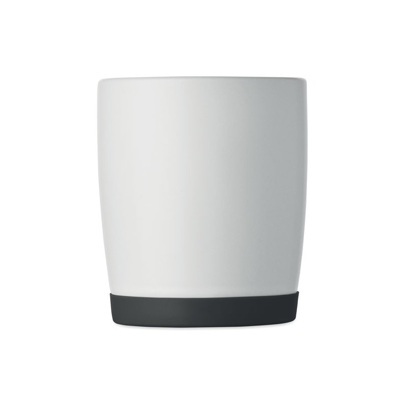 Caneca de cerâmica com acabamento branco mate e base de silicone para maior estabilidade. Capacidade 300ml. Embalagem individual em caixa de cartão branca.