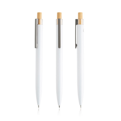 Esferográfica em alumínio reciclado com detalhe em bambu. Produzida a partir de alumínio proveniente de resíduos, através de processos de fusão e reaproveitamento. Ao escolher esta esferográfica, está a contribuir para a redução das emissões de carbono e para a diminuição de desperdício resultante da não reutilização. Possui tinta azul e um botão de pressão em bambu, seguindo as tendências actuais do mercado.