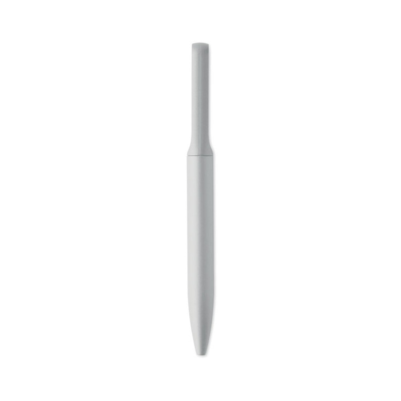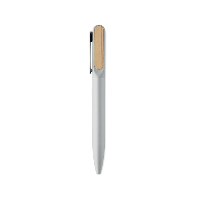 Caneta esferográfica de torção com corpo em alumínio reciclado, peça de torção em ABS reciclado e clipe de metal com pormenor em bambu. Tinta azul.