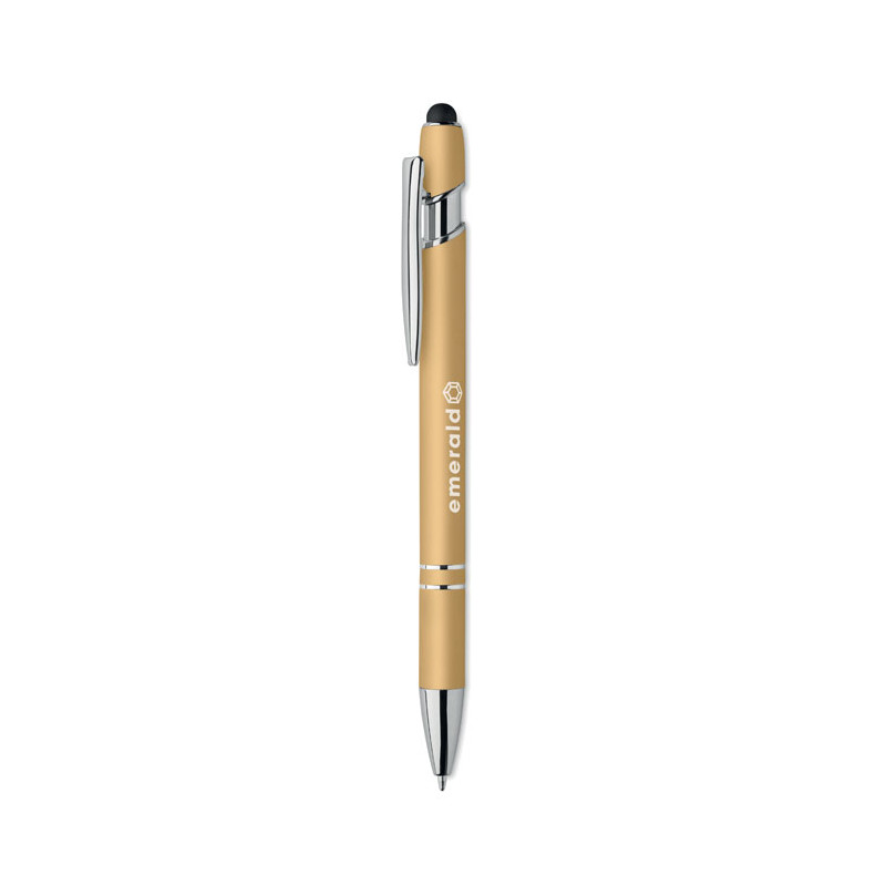 Caneta stylus personalizada em alumínio reciclado. Acabamento soft-touch premium e escrita fluida. O brinde ecológico e moderno para a sua empresa.